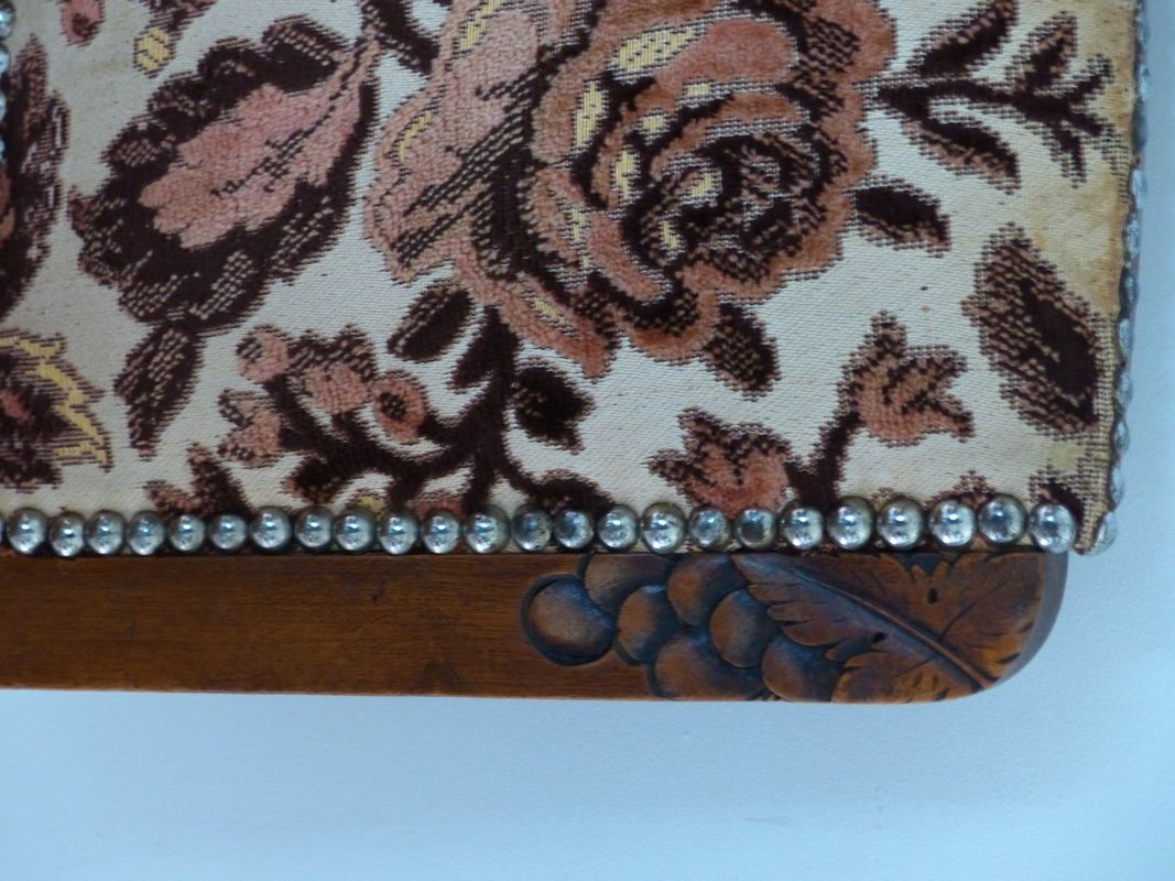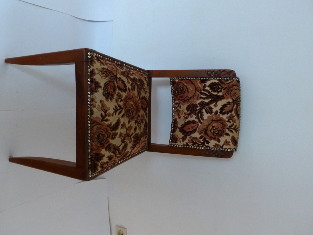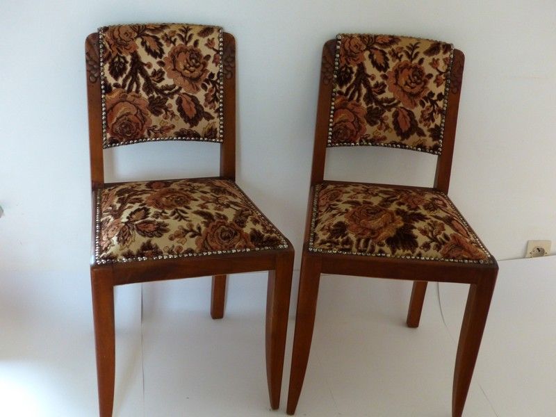Paire de charmantes chaises années 40 tapissées d'un tissu très vintage à motifs de roses. Fond beige, roses vieux rose, feuilles chocolat. Montants du dossier sculptés dans la partie haute. En très bon état, utilisables telles quelles, assises confortables et parfaitement rembourrées. Dimensions : hauteur de l'assise = 44 cm, hauteur dossier = 81 cm, largeur = 43 cm, profondeur = 41 cm