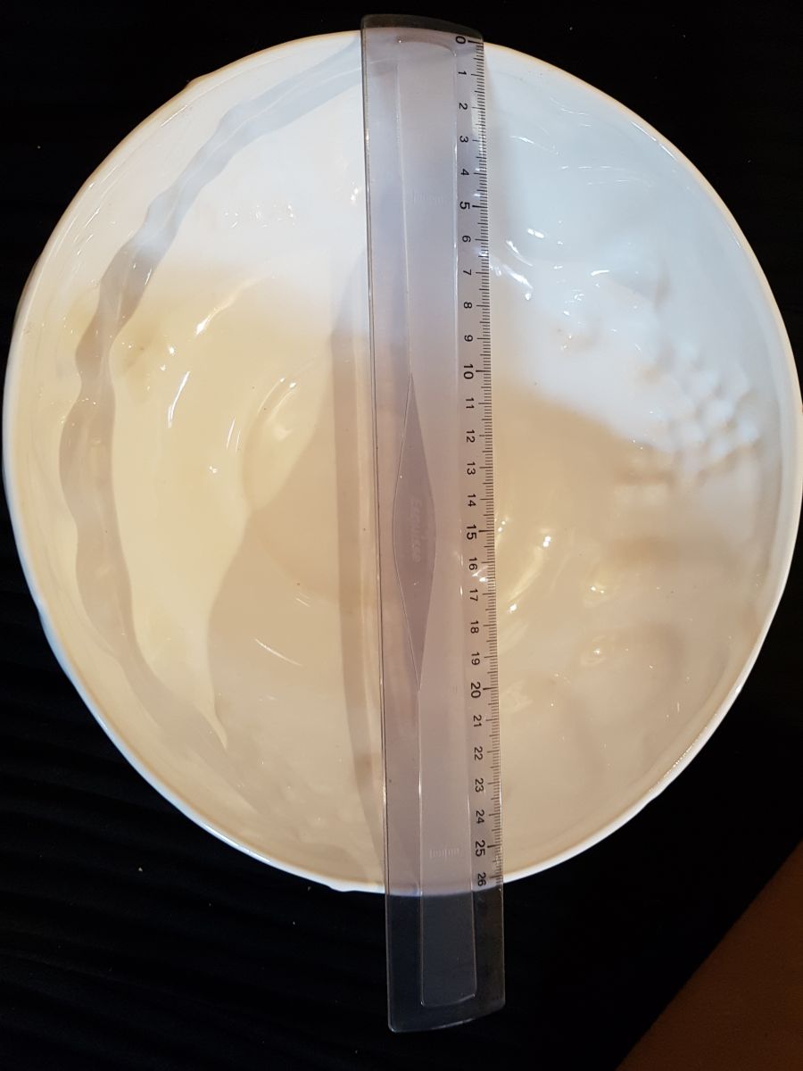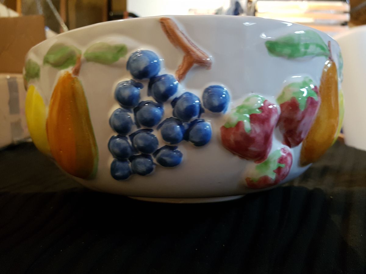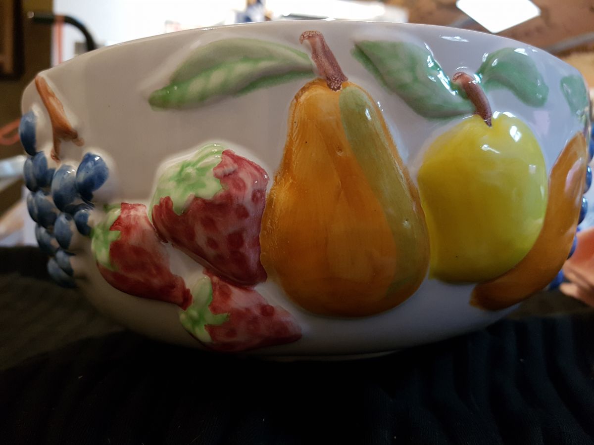 Saladier ou coupe à fruits, avec décor style barbotine. Fruits tout autour.
