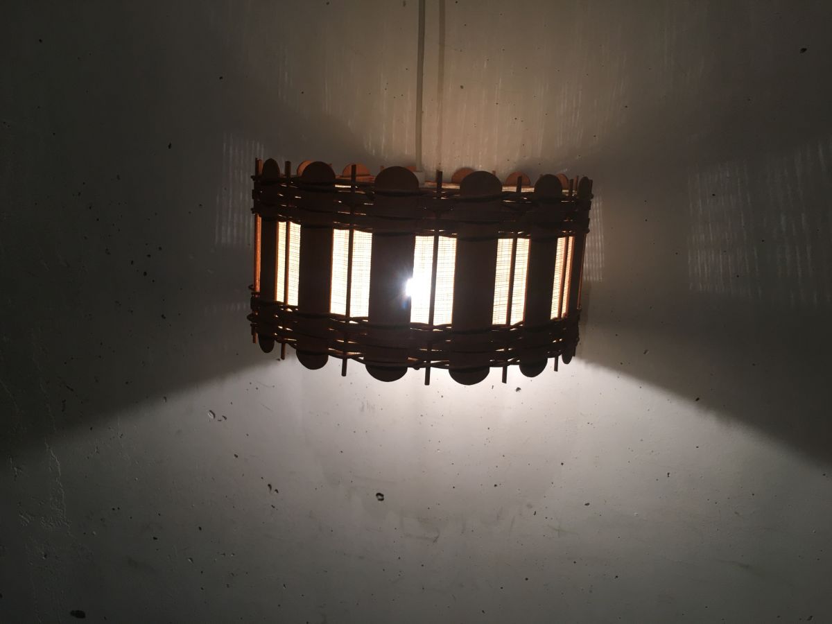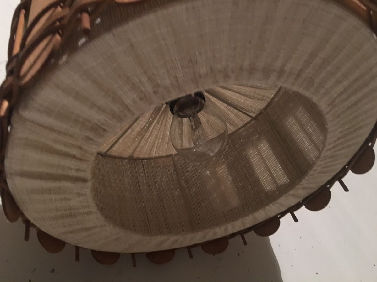 Suspension en bois et rotin des années 60, garnissage intérieur en tissu blanc, très bel effet d’éclairage, ampoule à vis, diamètre 33cm, hauteur 19cm, bon état.