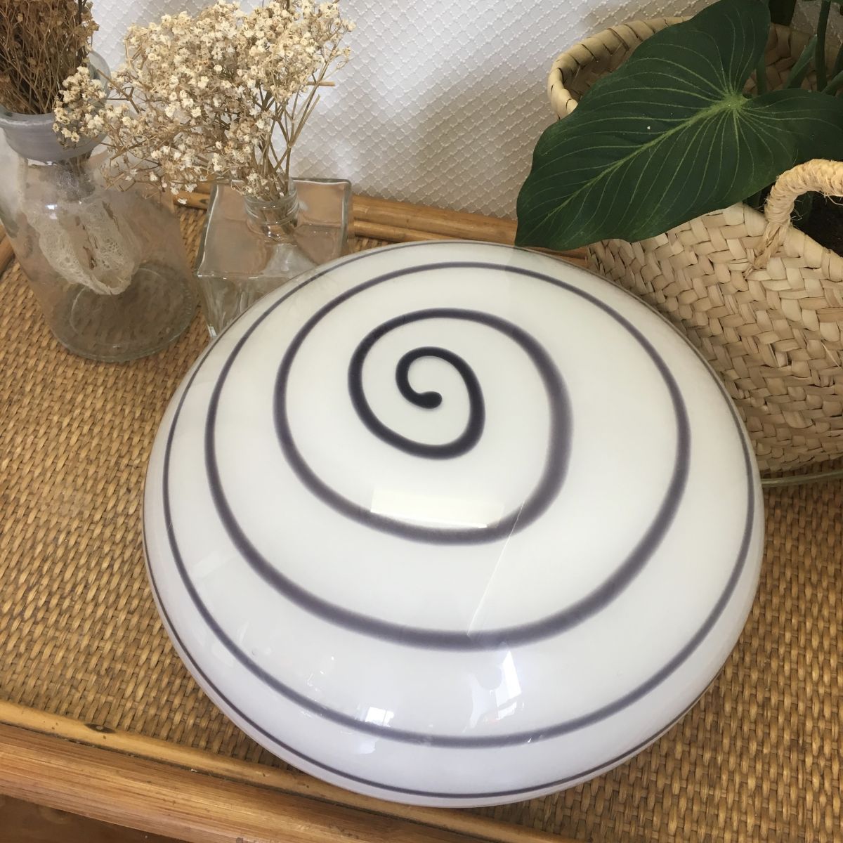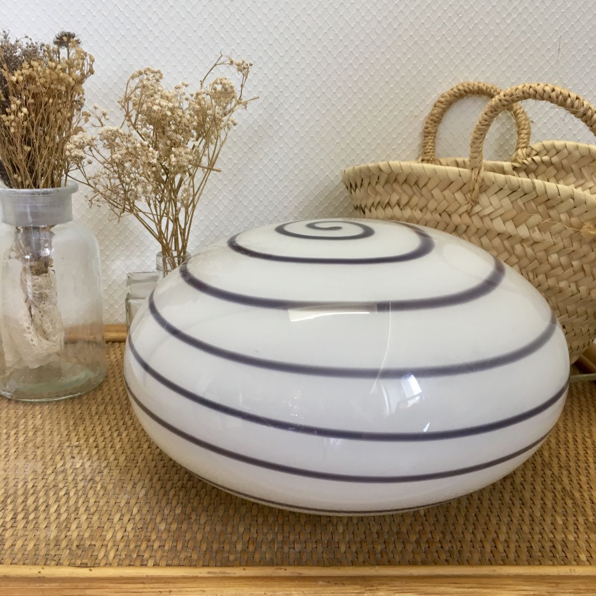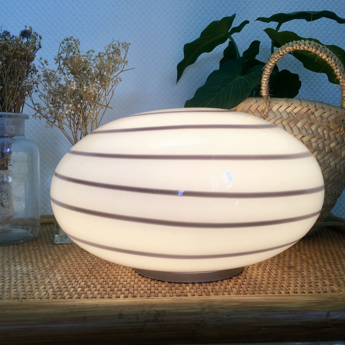 Superbe et étonnante lampe à poser vintage forme champignon en opaline blanche des années 1960 1970. En excellent état, elle est montée sur un petit socle en cercle métallique et s'allume par une prise classique. Celle lampe rare et étonnante typique de ces années donne un très bel effet de lumière une fois allumée avec ses rayures psychédéliques. Électricité parfaitement conforme. Dimensions (cm) : Hauteur 28 x Largeur 32.