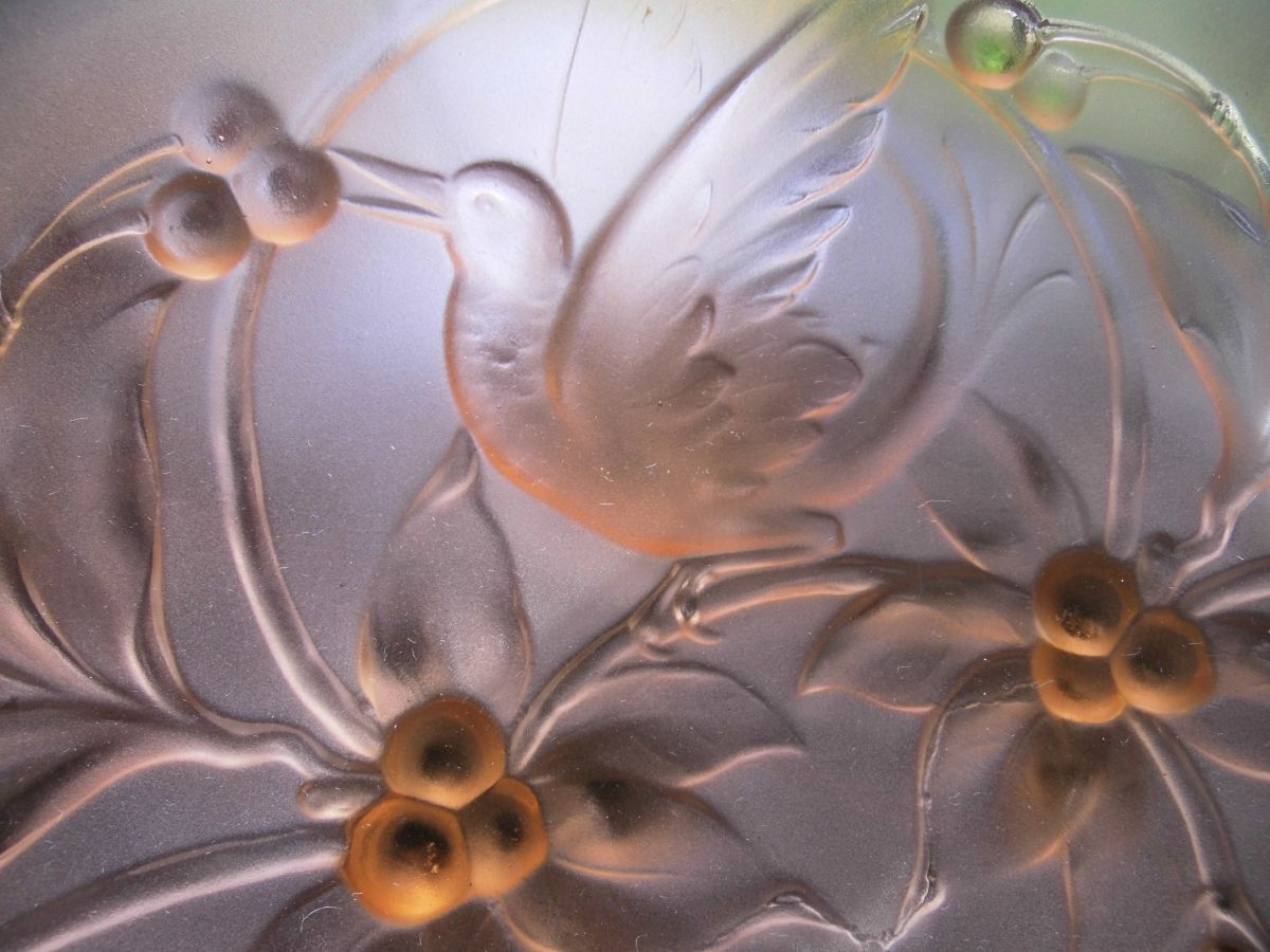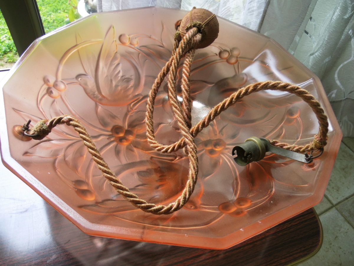 Grande suspension COMPLETE en coupe ARTS-DÉCO en verre moulé à motifs d'oiseaux.