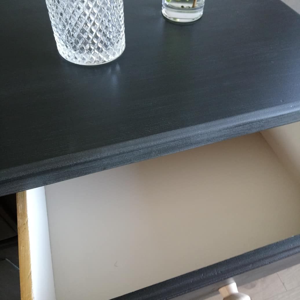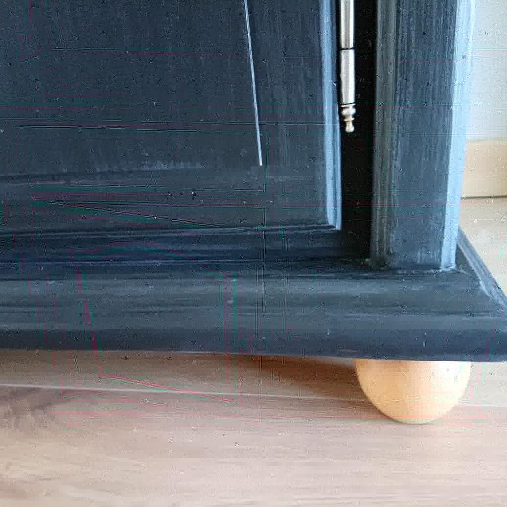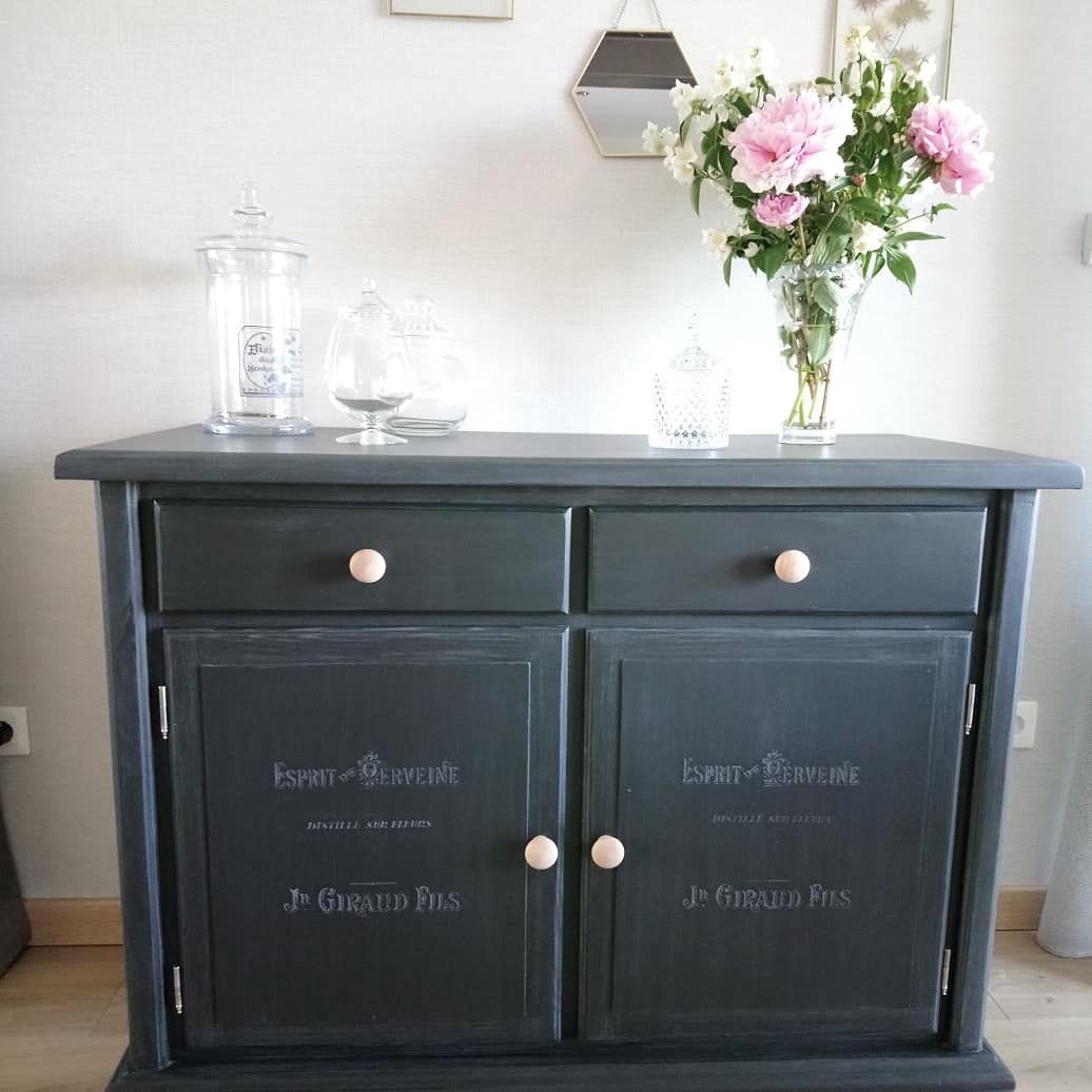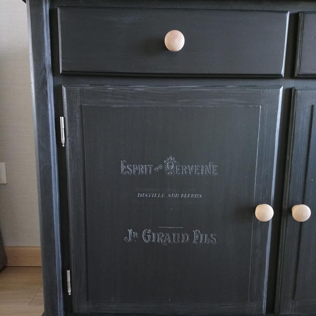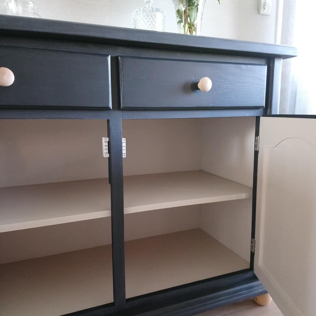Buffet entièrement relooké, peint en noir mat puis vernis incolore mat, intérieur peint en lin, boutons de porte et pieds neufs. Meuble peu encombrant, de qualité et unique