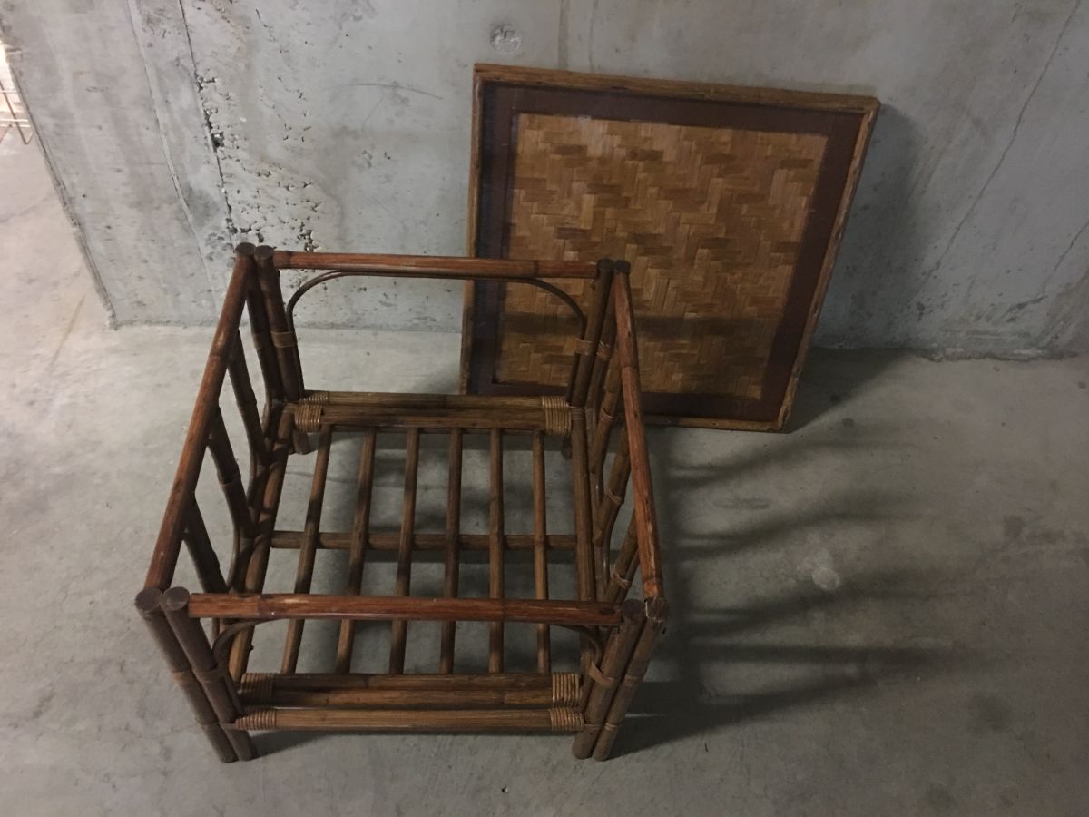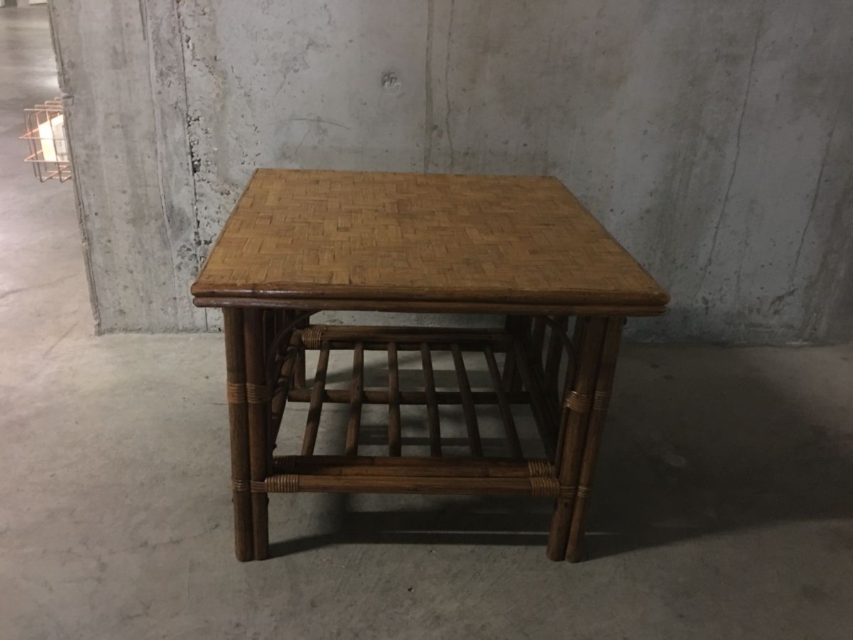 Très jolie petite table basse en rotin des années 60, superbe patine, plateau amovible, dimensions (cm) : L.60xH.47xP.60, bon état.