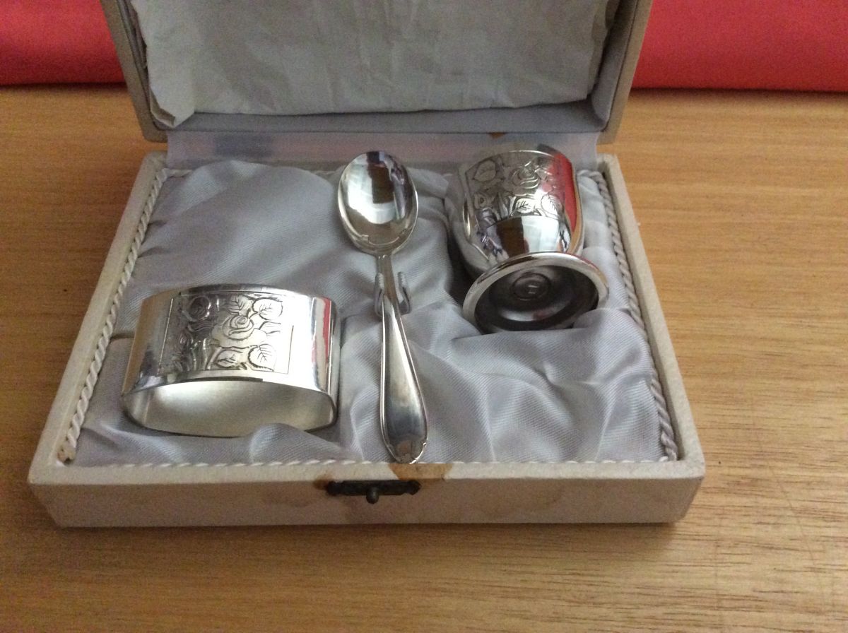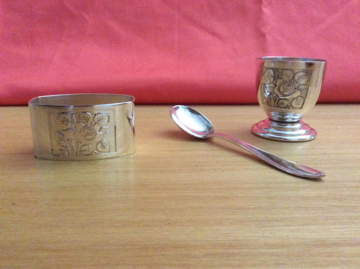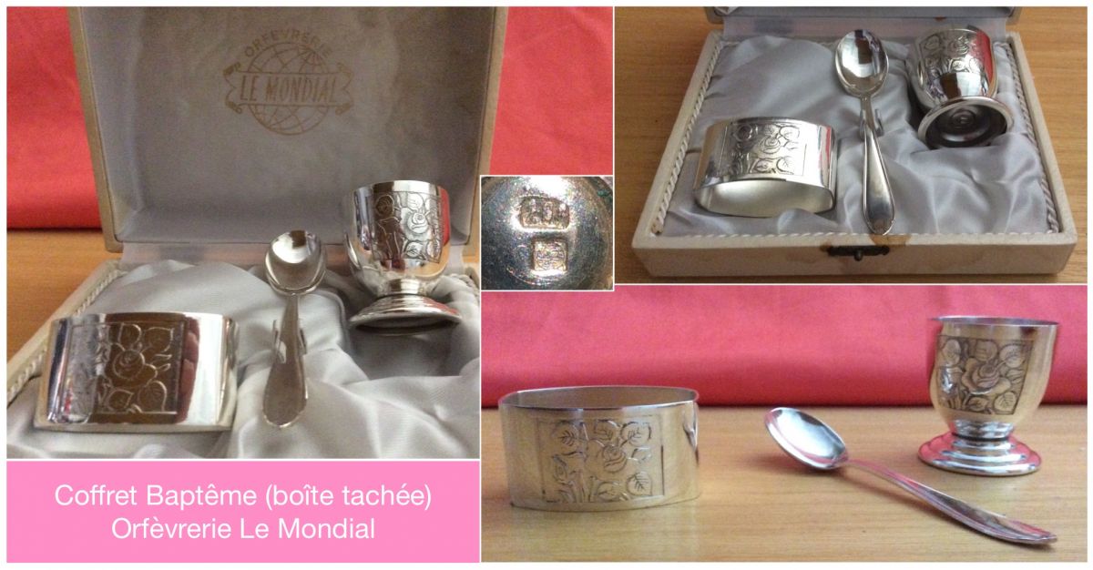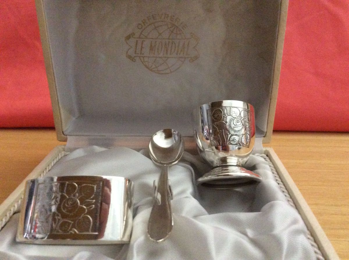 Coffret Coquetier, Cuillère Moka & Rond de Serviette. Coffret en l’état (voir photo).