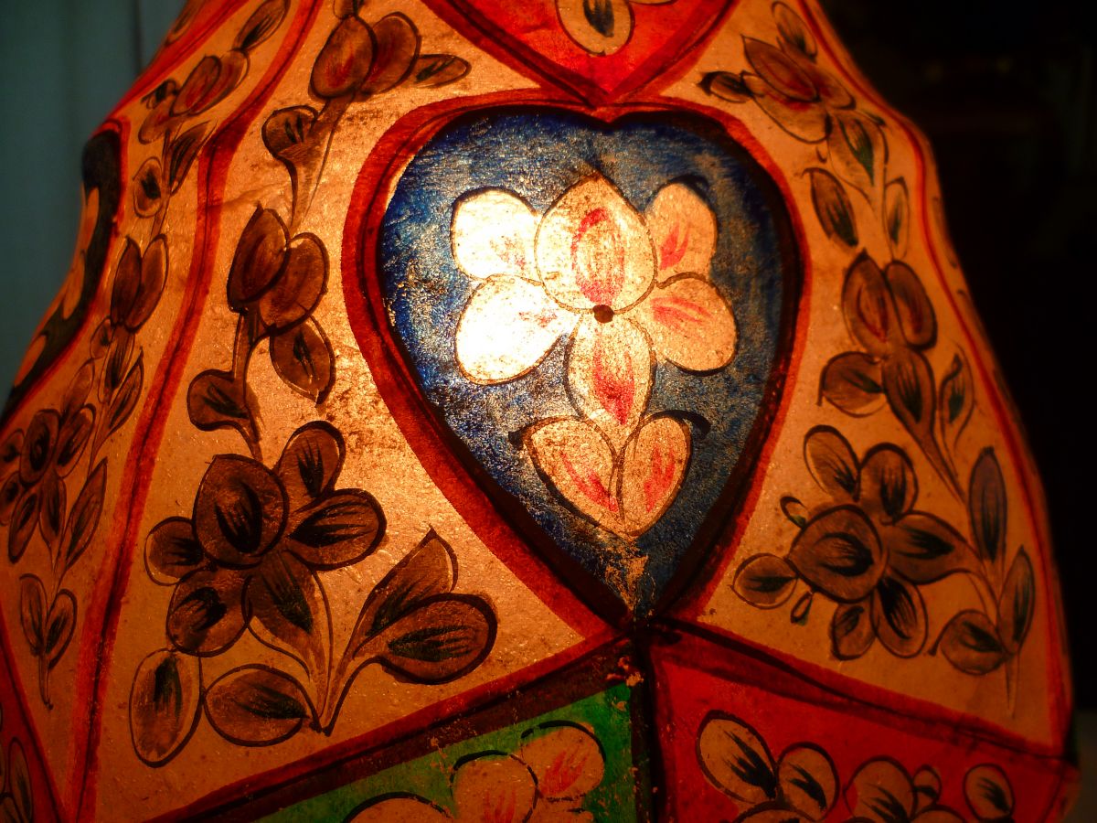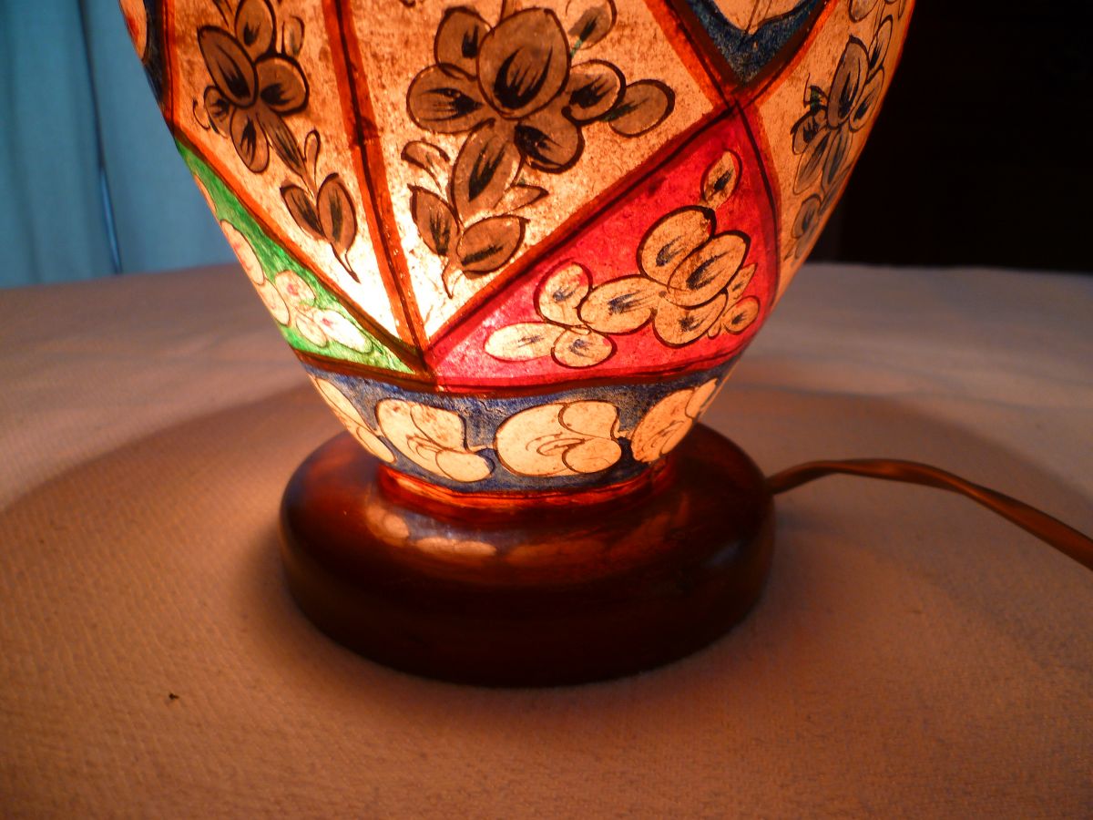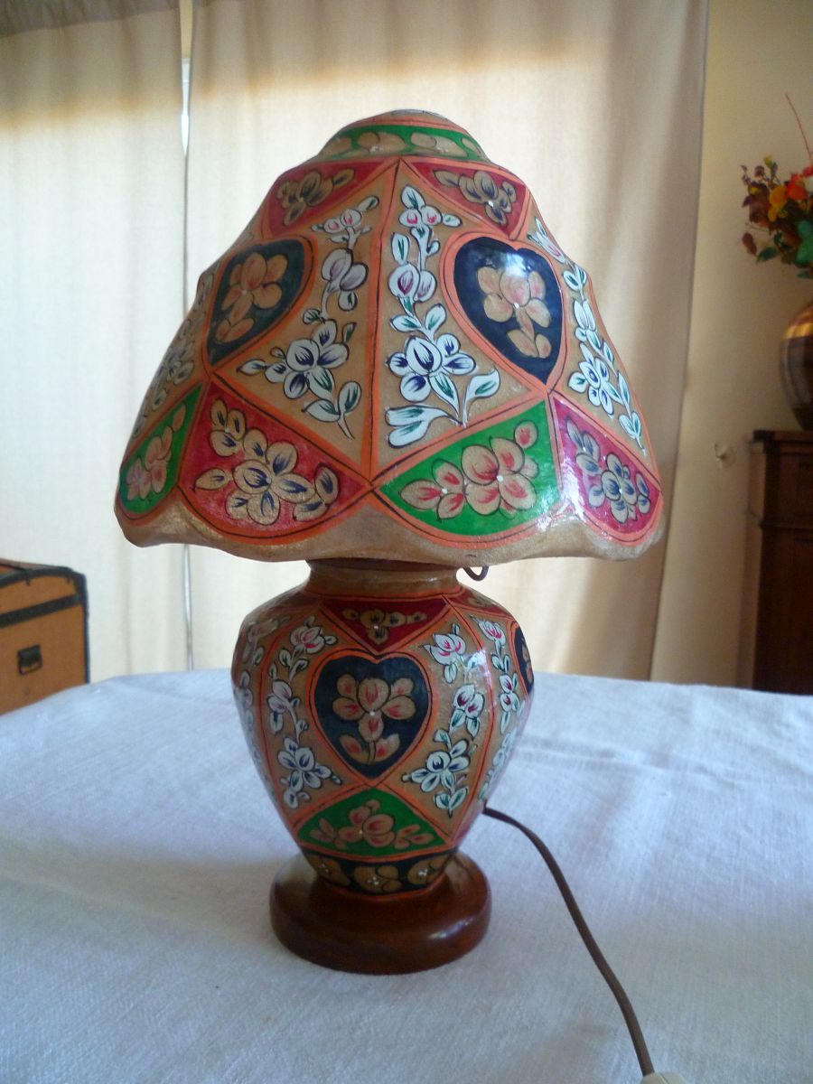 Lampe en cuir de chameau, artisanat du Pakistan, peint à la main, rapportée fin 1979. Diamètre base chapeau 27 cm, hauteur 40 cm.