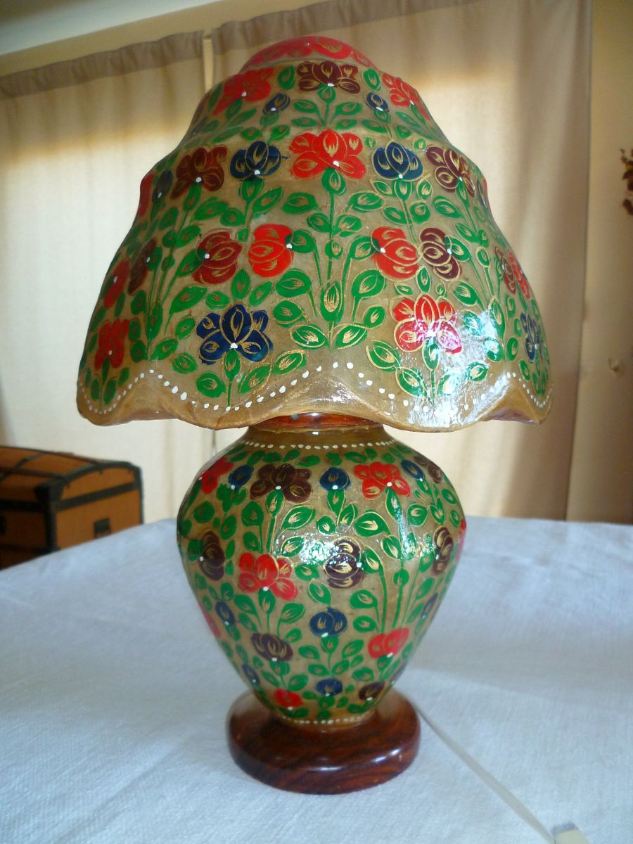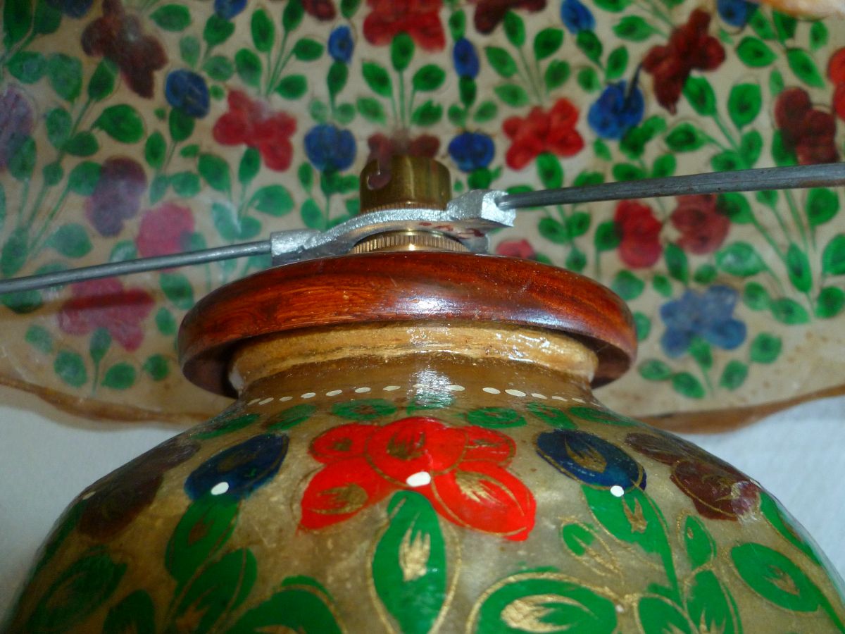 Lampe en cuir de chameau, artisanat du Pakistan, peint à la main, rapportée fin 1979, diamètre base chapeau 27 cm, hauteur 40cm.