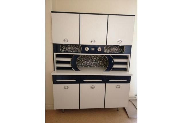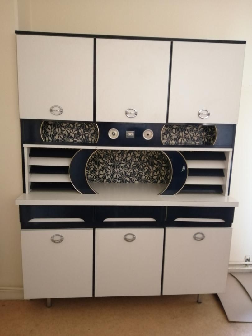 À vendre un meuble de cuisine vintage en formica blanc et bleu indigo.