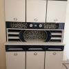 Trois placards hauts avec étagères, trois tiroirs centraux et trois placard bas avec étagères.