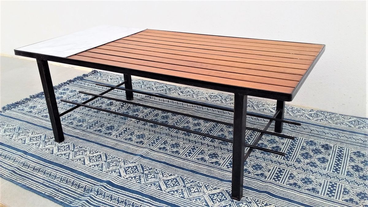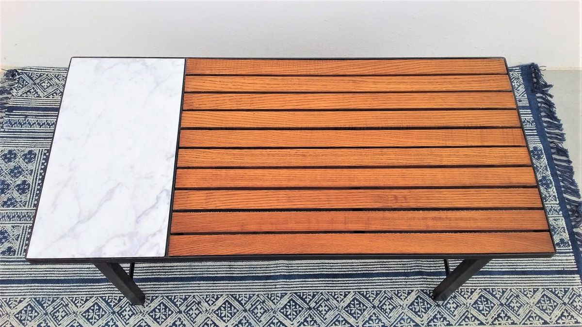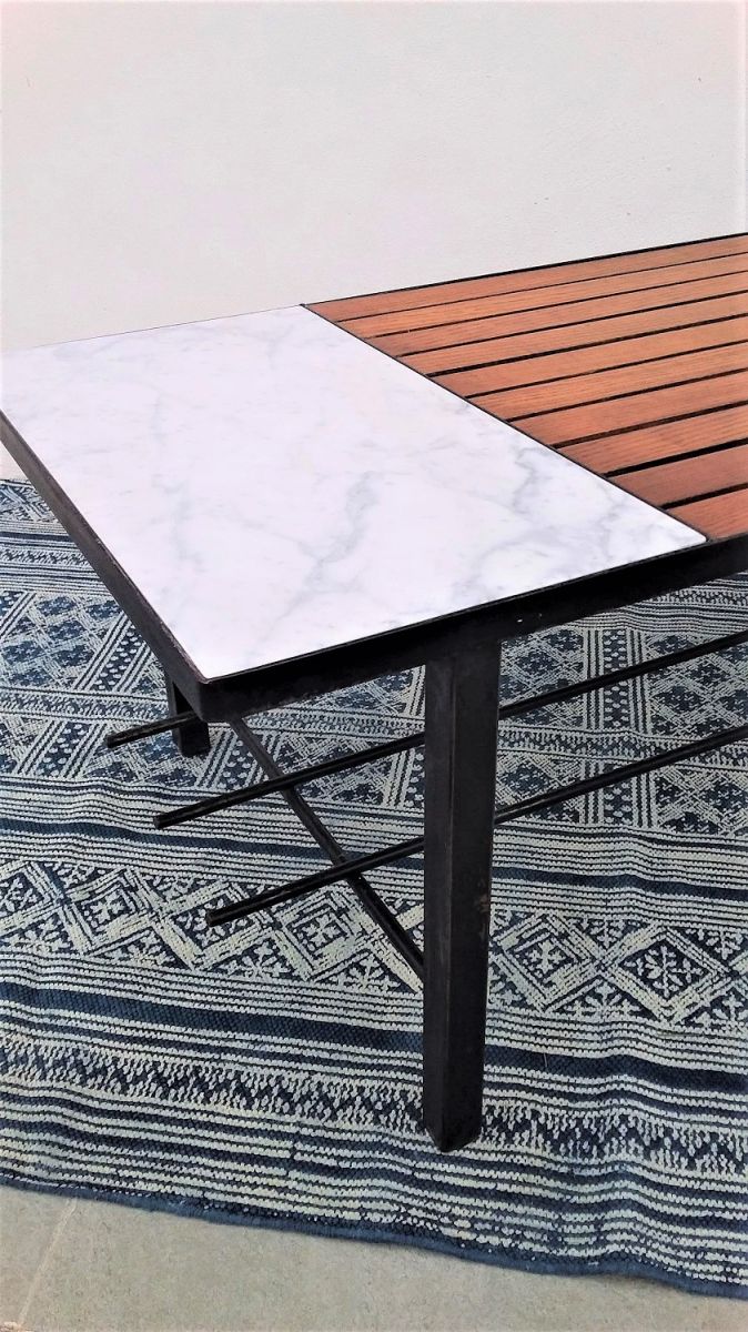 Structure en métal, plateau composé de lattes de chêne et de marbre de carrare.