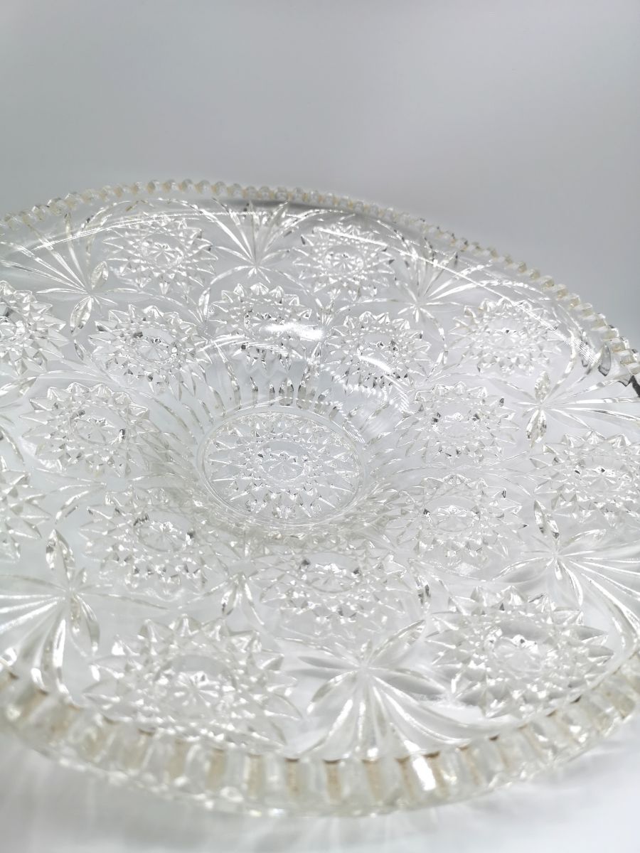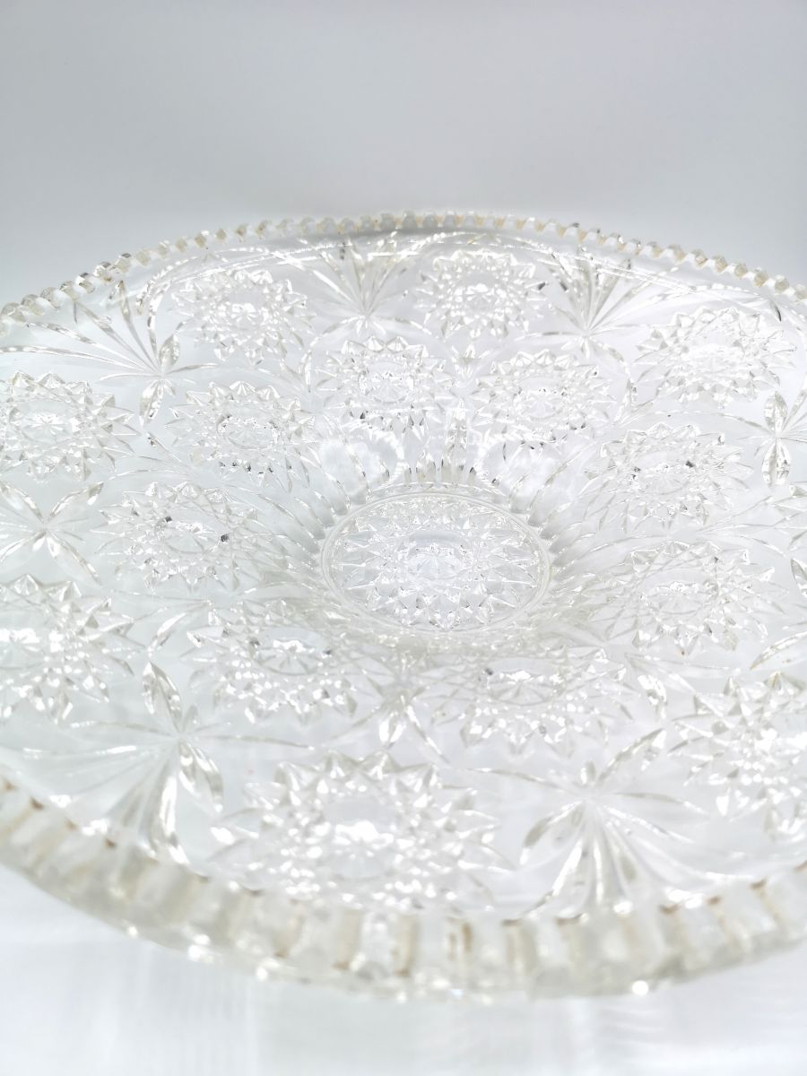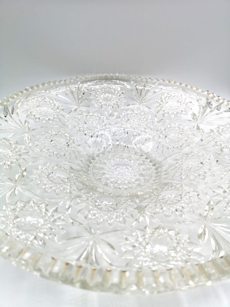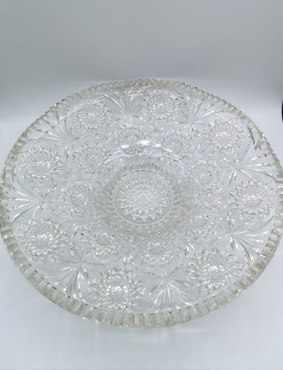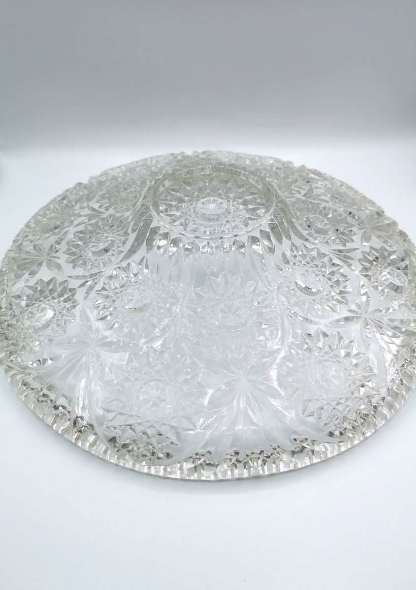 Grande coupe à fruits, plat de service, en verre moulée. Estimée au minimum aux années 70 mais peut être plus ancienne. En parfait état.
