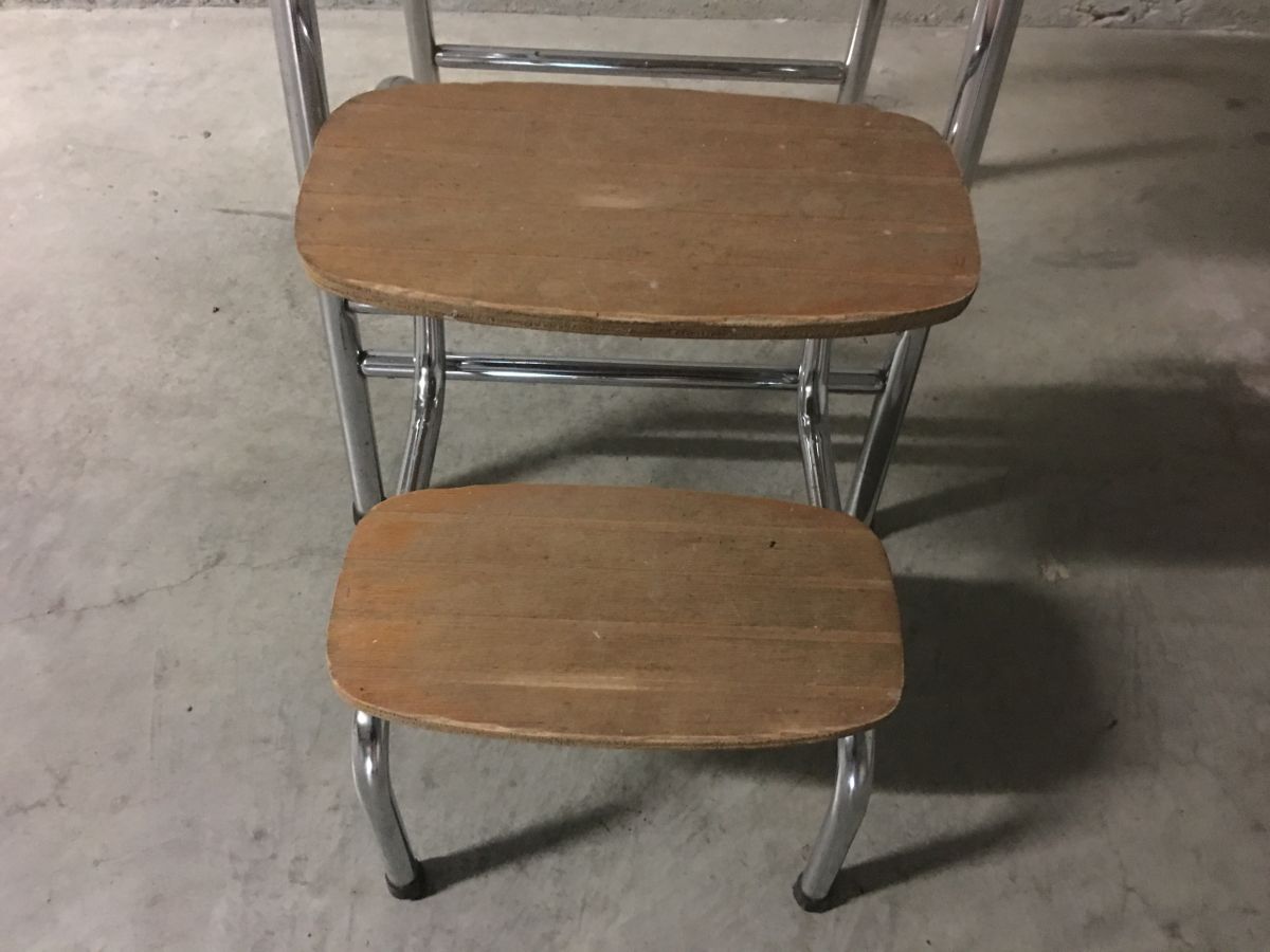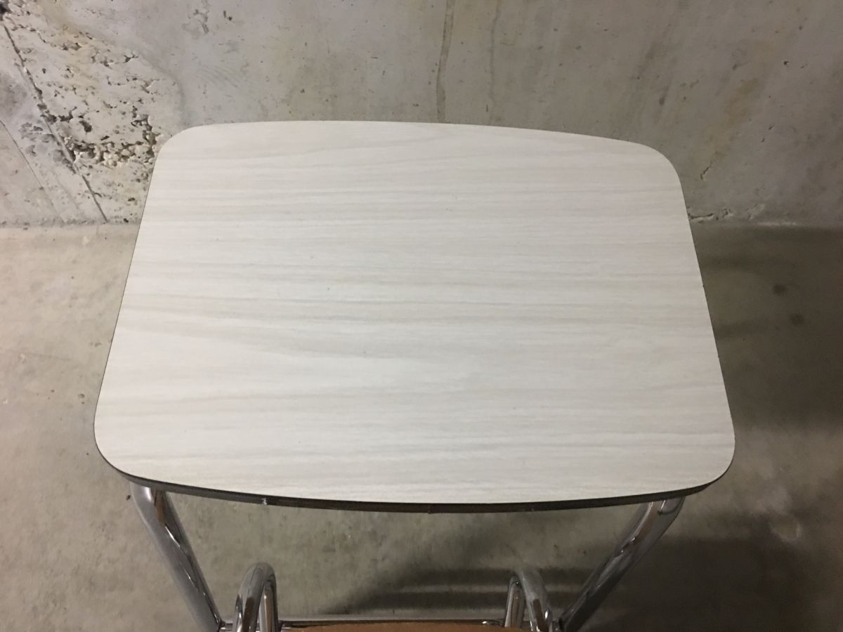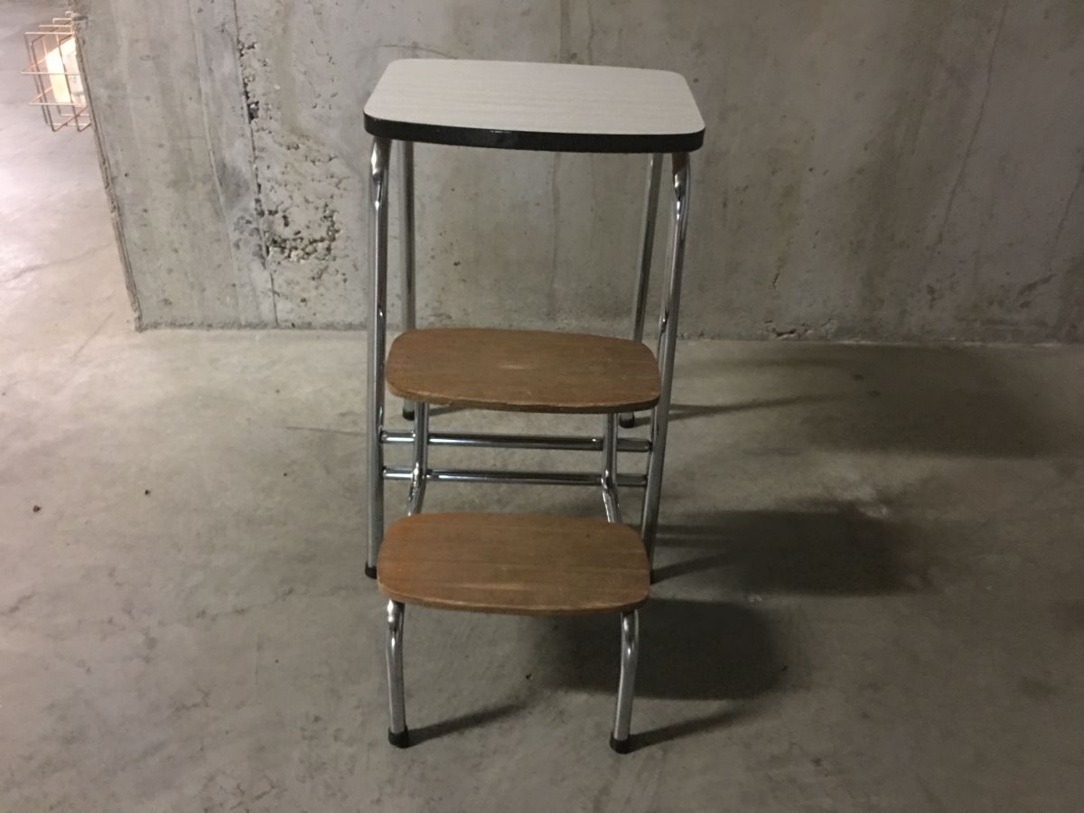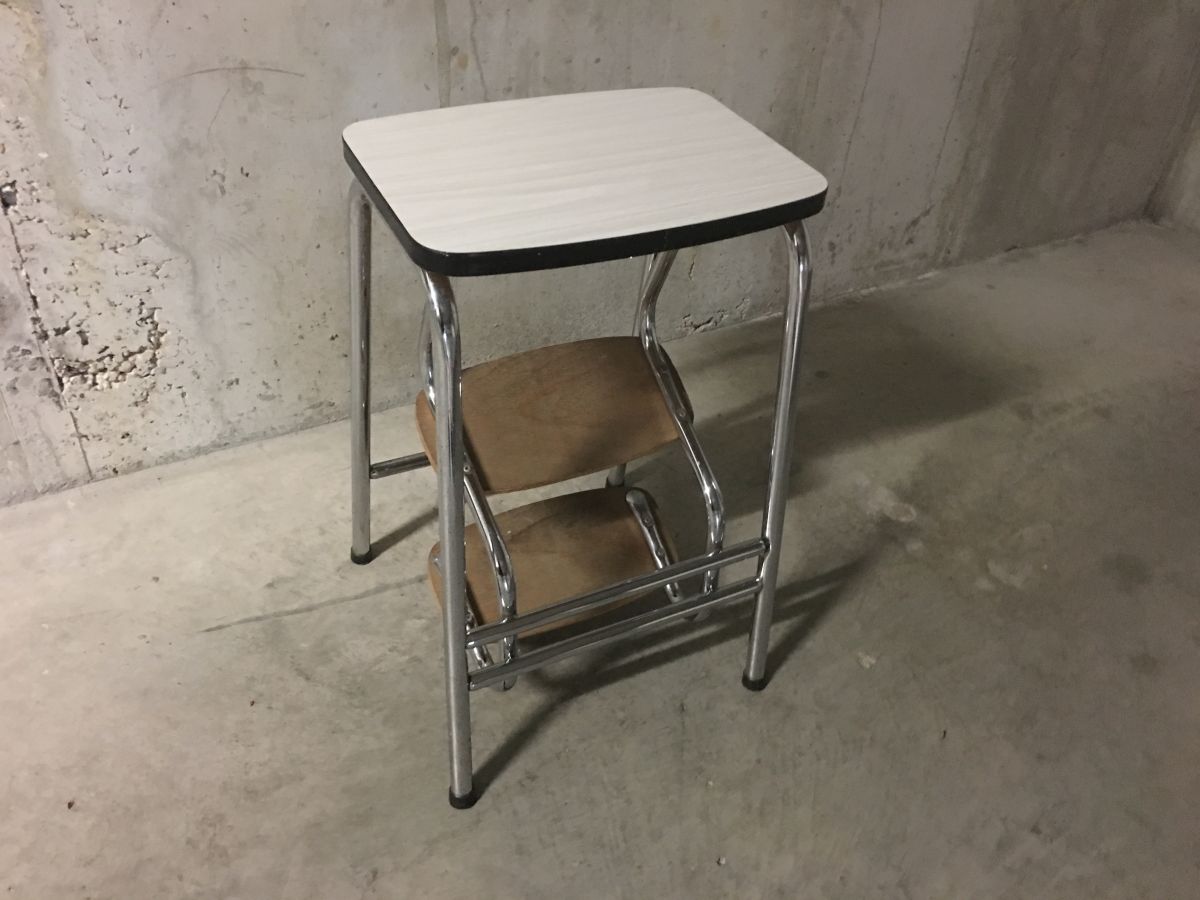Tabouret marche-pied en formica blanc et métal tubulaire des années 70, piétement très solide et stable, hauteur 59cm, assise 37x28cm, bon état.