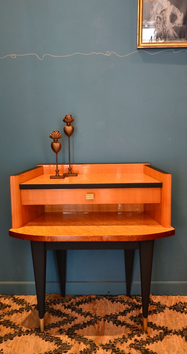 Table de chevet original année 50-60, Pieds repeint en noir mat pour une meilleur mise en valeur de sa couleur qui apportera de la lumière à votre intérieur . Sa forme reste rare et lui donne un côté classe.