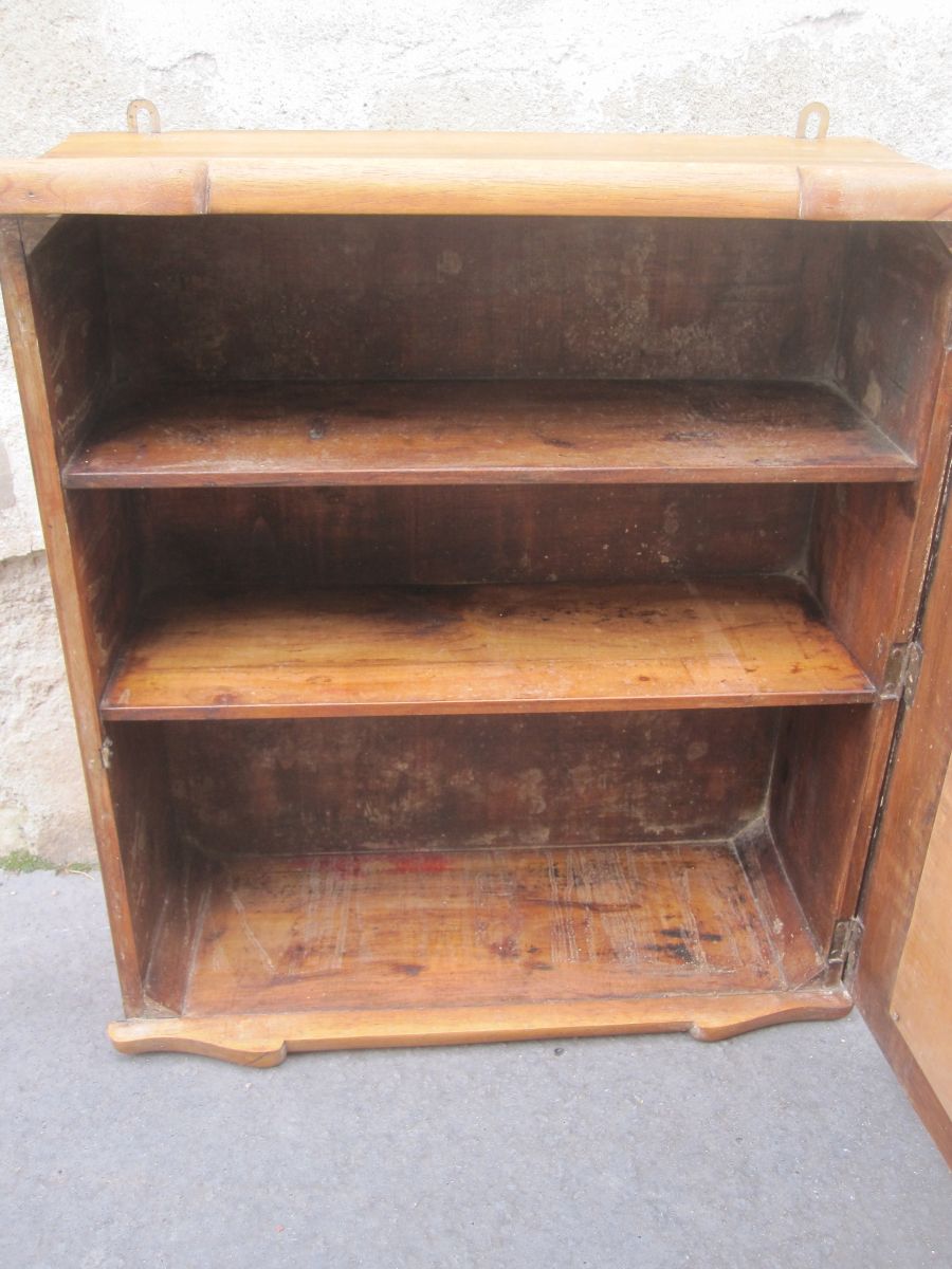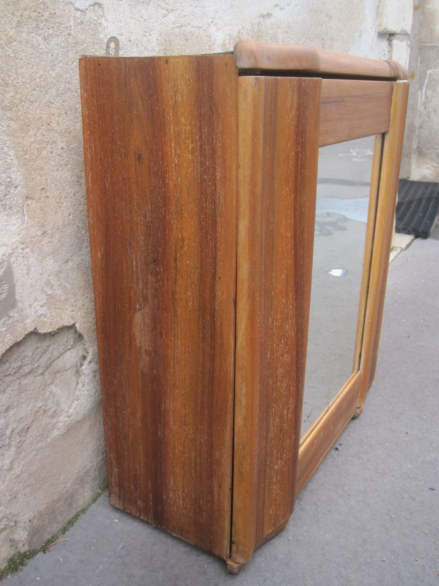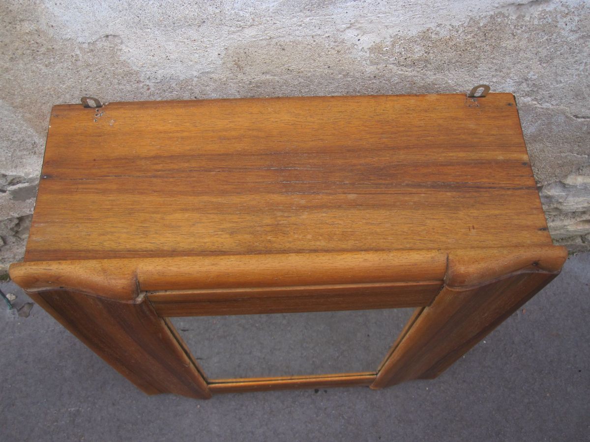 elle a été poncé et traité. elle est en chêne et murale. hauteur 61 sur 54 cm. format miroir 40 sur 29 cm. quelque marque sur la miroir.