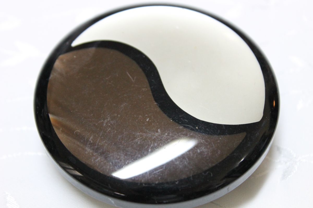 Boucle de ceinture vintage seventeen, ronde yin et yan couleur caramel et champagne, effet nacré. Diamètre 68 mm. pour lanière max 45 mm