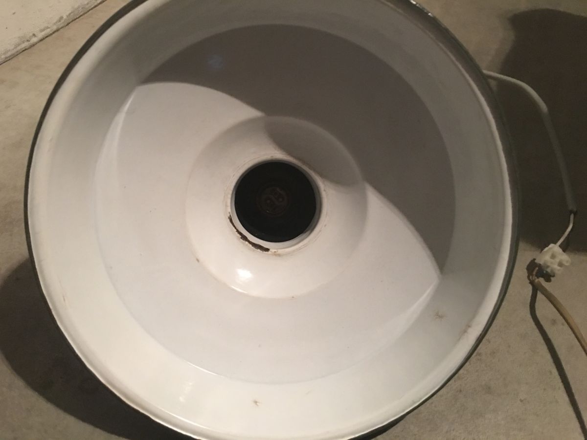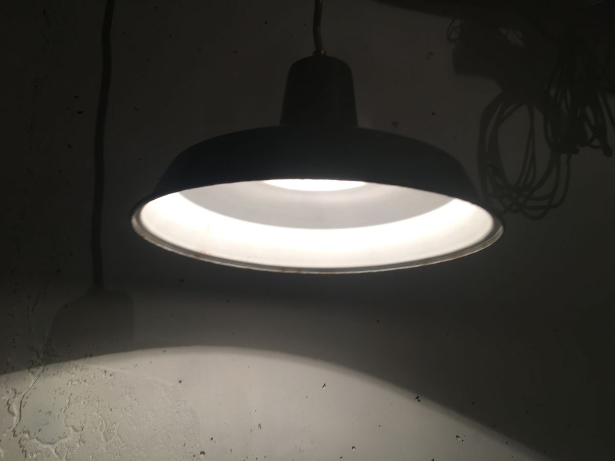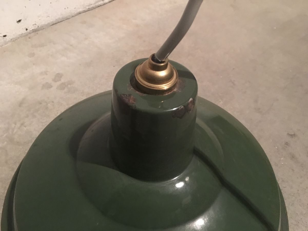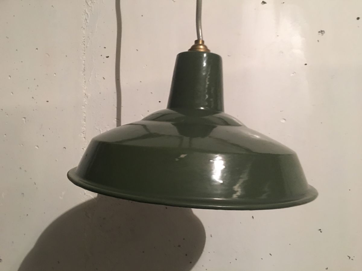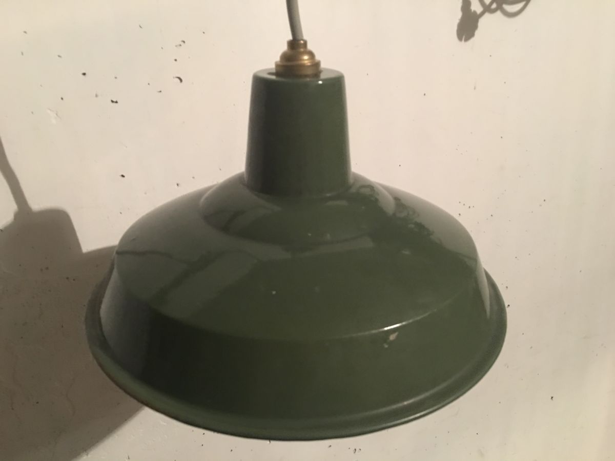 Suspension d’usine en tôle émaillée verte, quelques petites traces du temps sur l’émail participant au charme et au vécu de la lampe, fonctionne parfaitement, douille baïonnette, diamètre 30cm, hauteur 16cm, bon état.