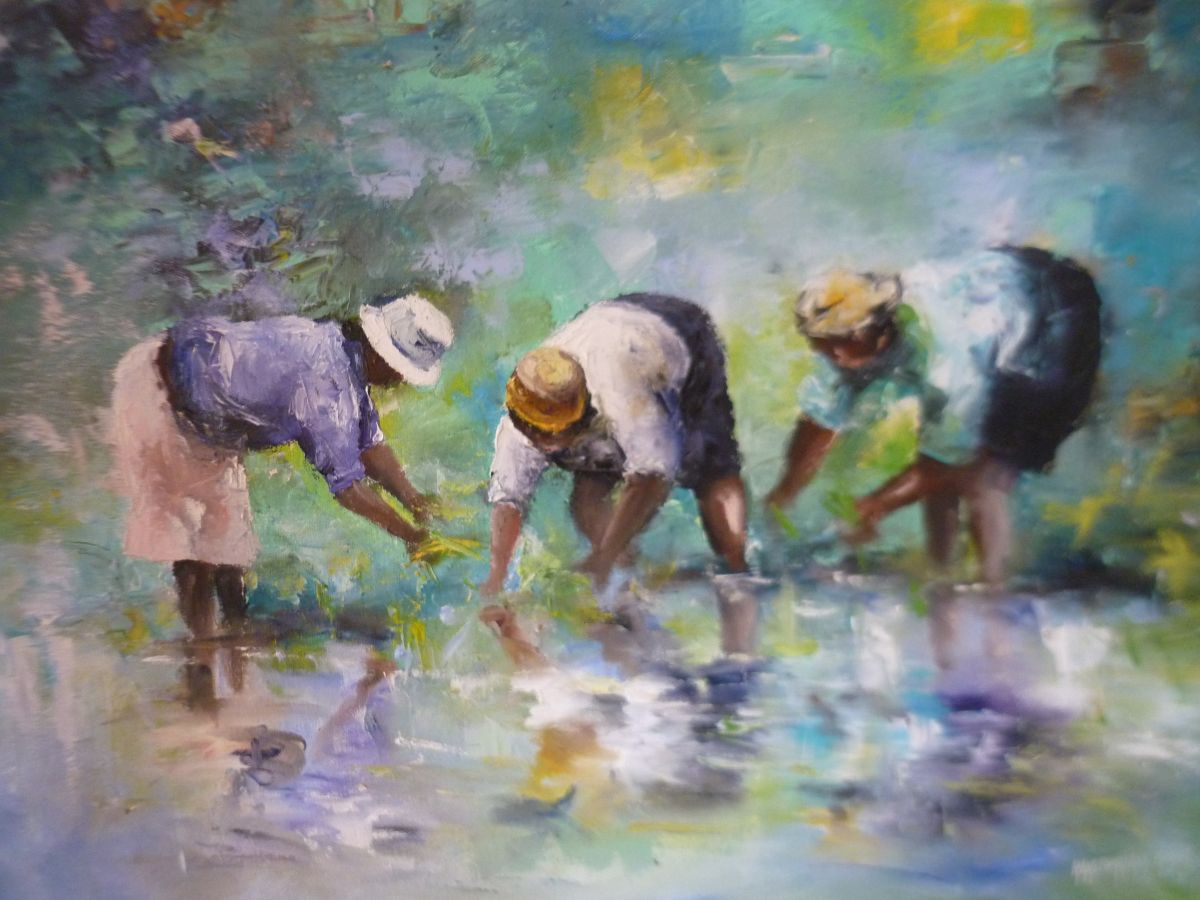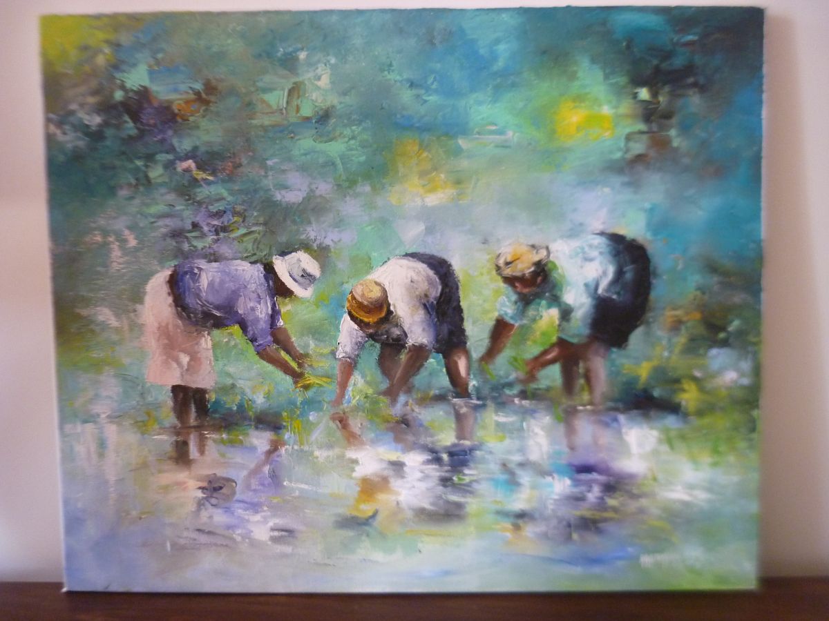 Huile sur toile de l'artiste malgache coté et reconnu internationalement Hugues RAKATOMALALA, "Les Repiqueuses"