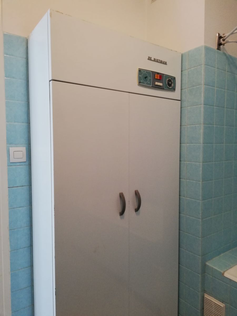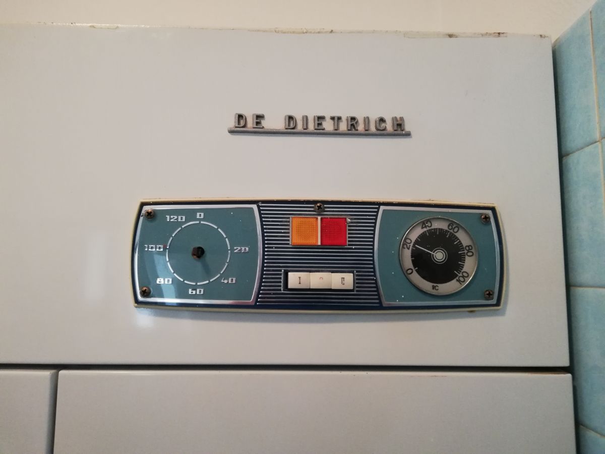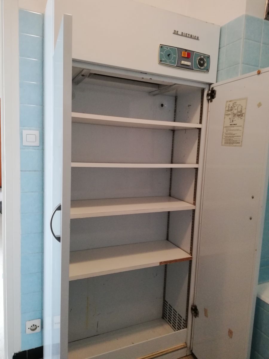 je viens de faire l'acquisition d'un appartement dès années 70. Dans la salle de bain, une armoire métallique séchante de marque Dietrich à sa place depuis la construction de l'immeuble. Elle n'est pas en état de marche. Je n'ai pas vu de prise électrique, elle a été supprimée. Je n'ai repéré aucun point de rouille. Des étagères ont été installées.