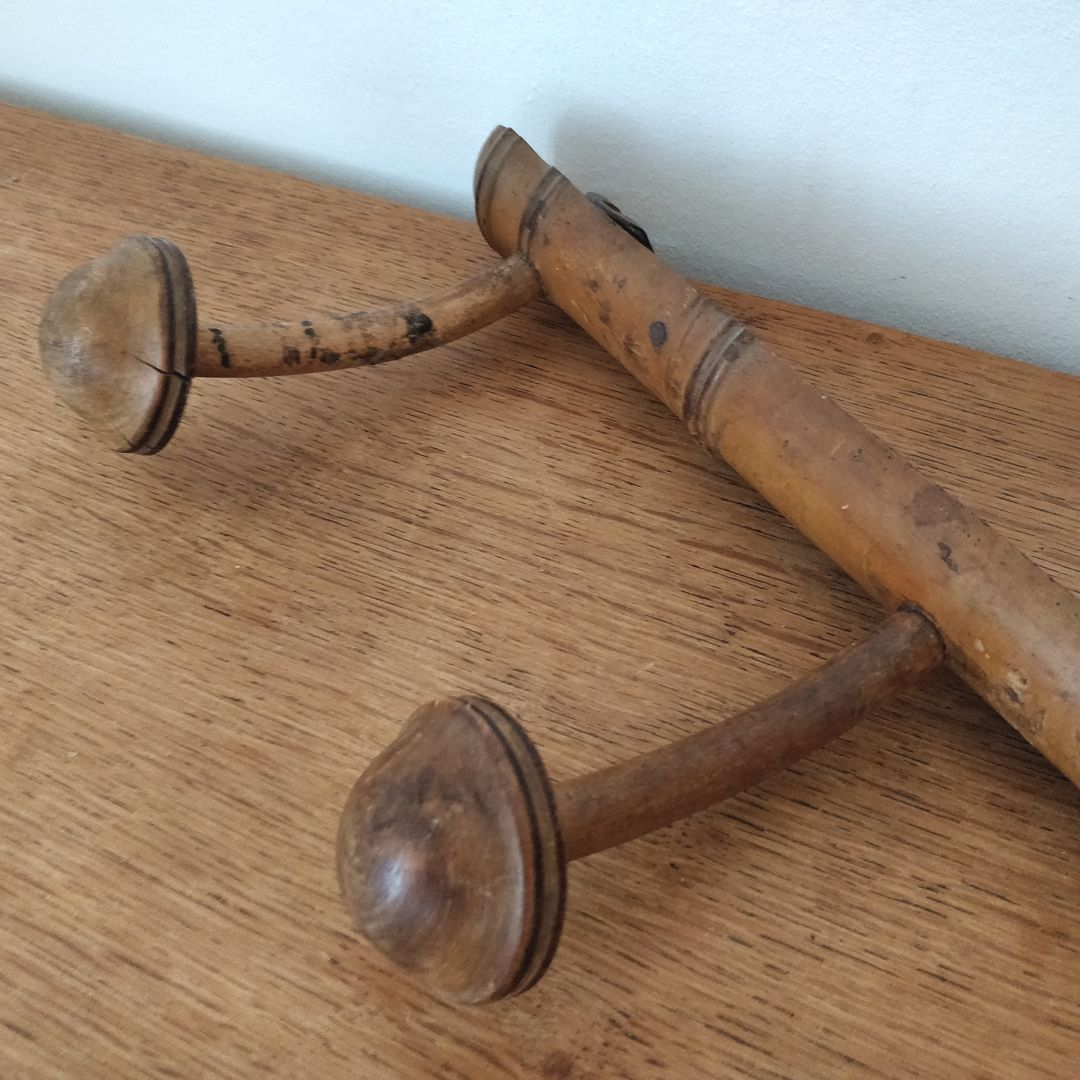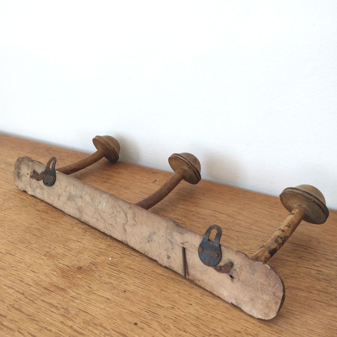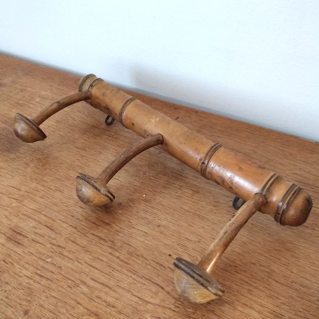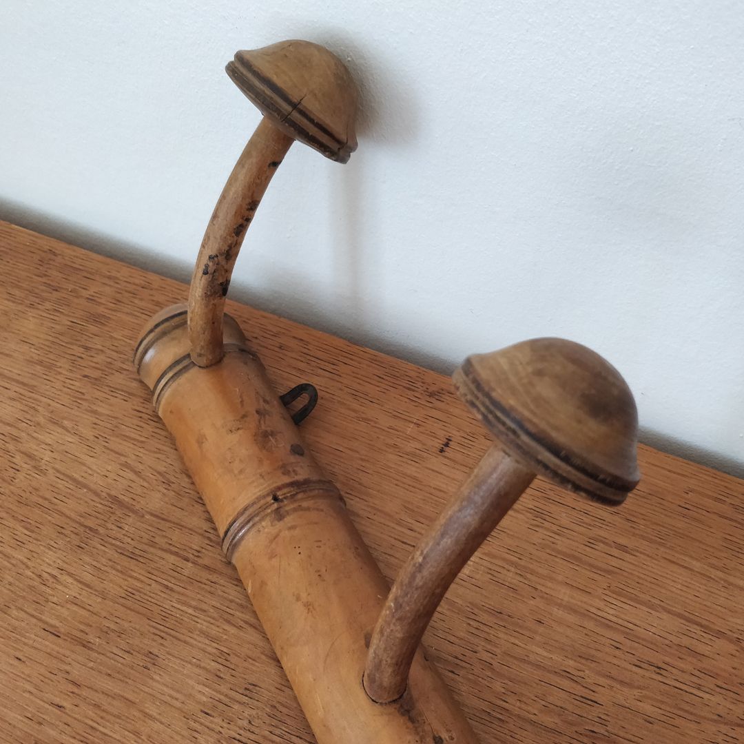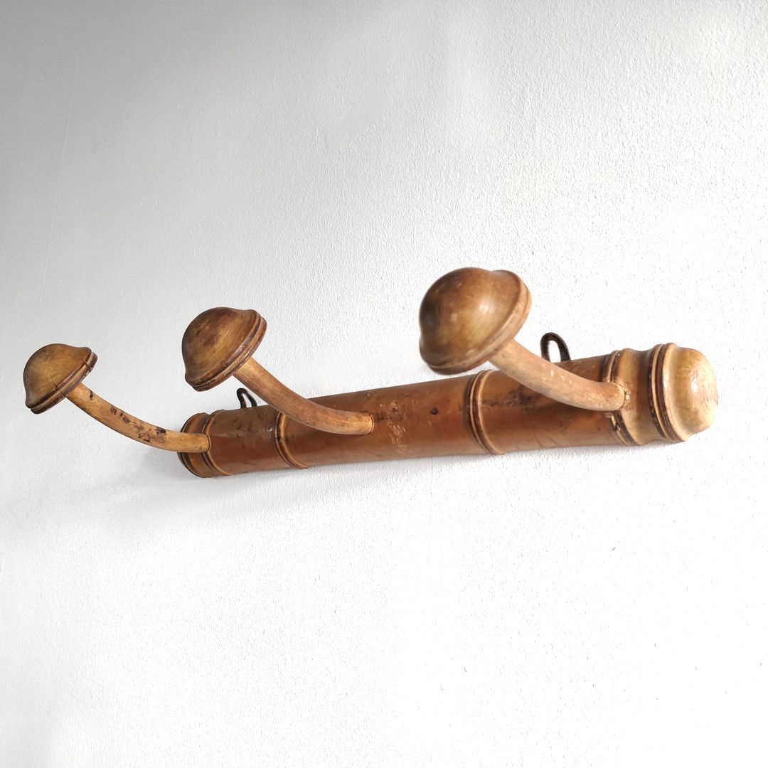 Ancien porte manteaux en bois brut composé de 3 patères forme champignon. Traverse sculptée faux bambou. Idéal pour la décoration d’une entrée ou d’une chambre.