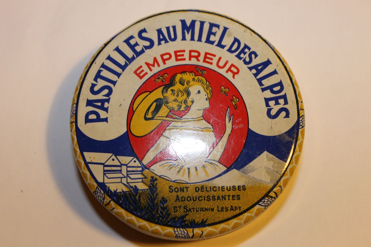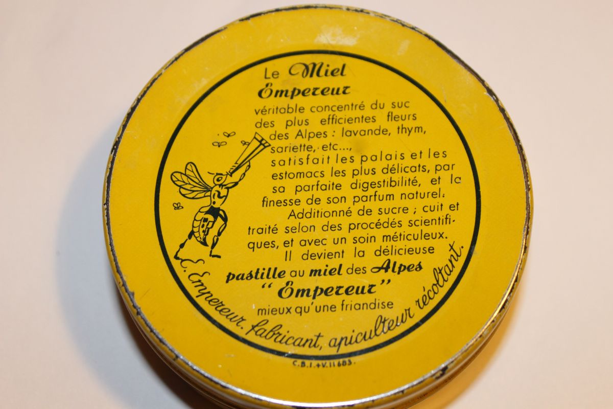 ancienne boite métal pastilles au miel des Alpes