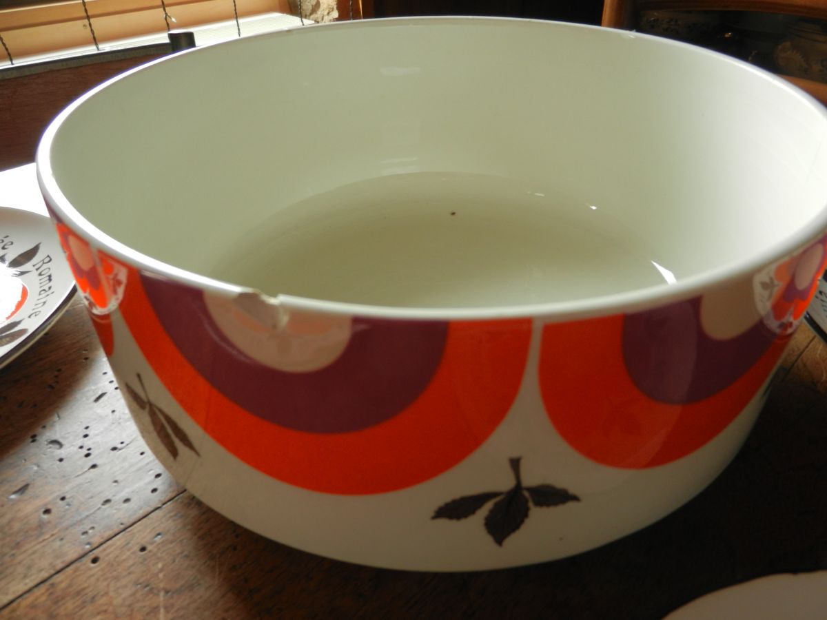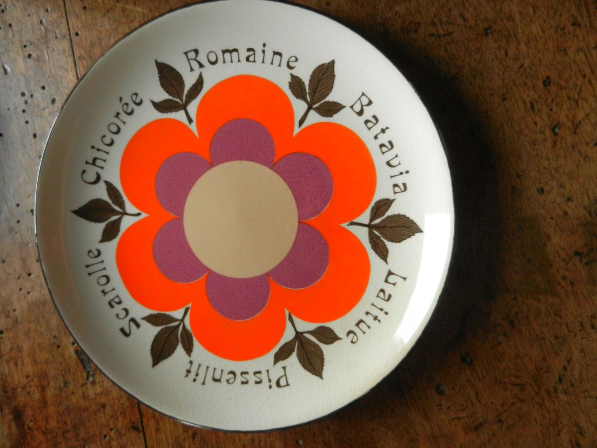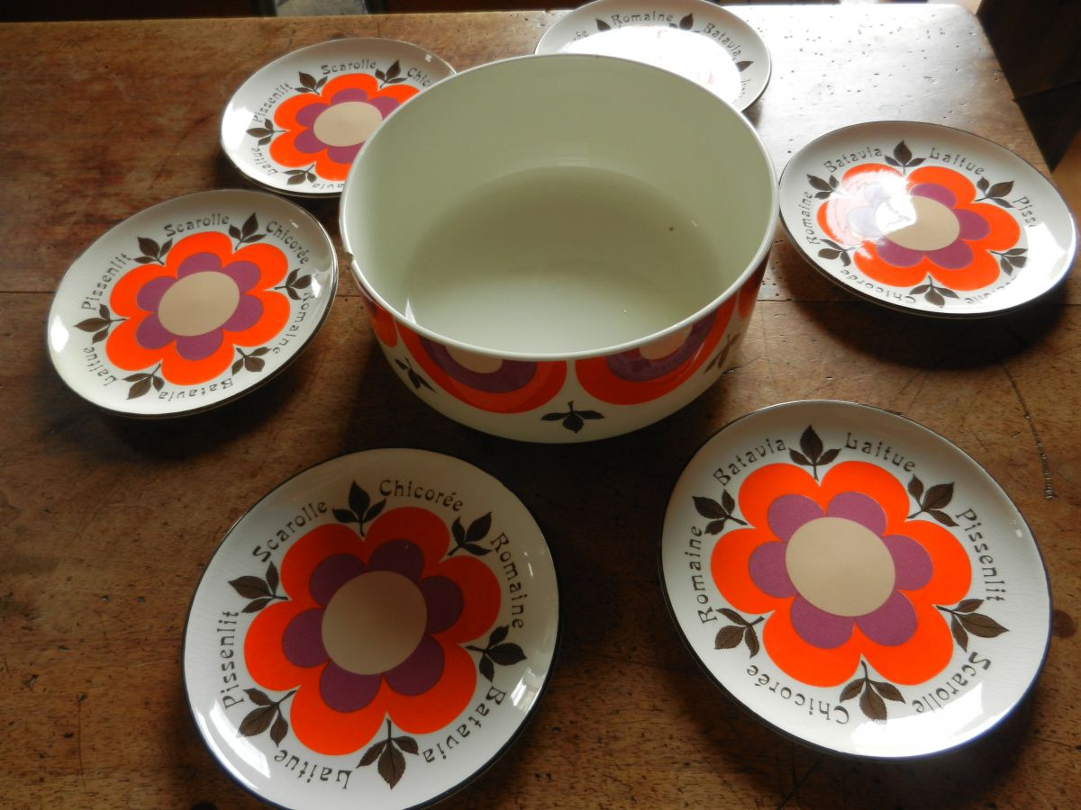 ensemble des années 70, composé de 6 assiettes en très bon état et d'un saladier comportant une ébréchure.