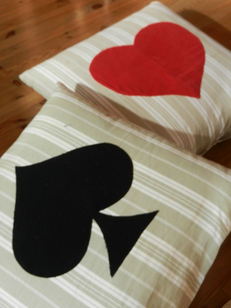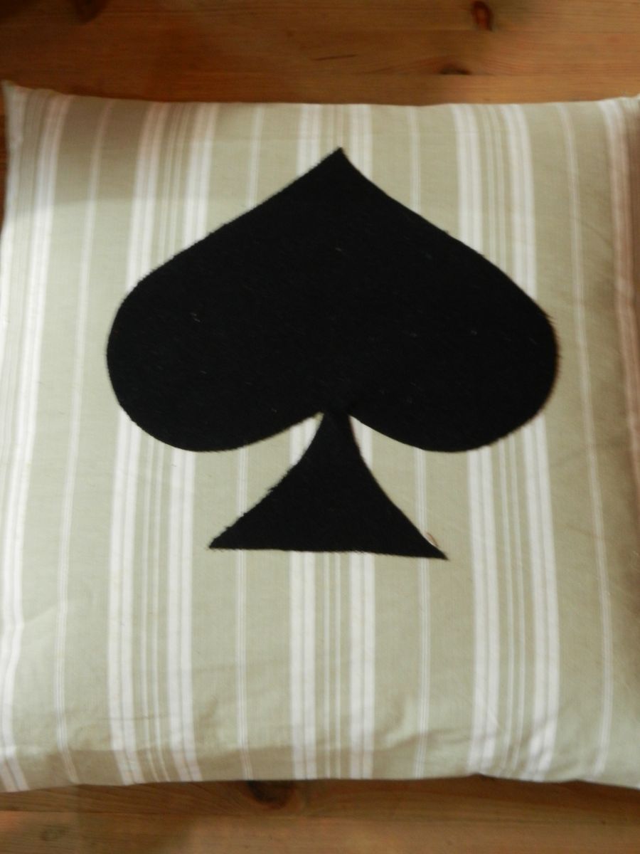 Pièces uniques, ces 2 grands coussins de sol rigides sont recouverts de toile à matelas rayée, velours rouge pour le coeur et feutre noir pour le pique ! dimensions 60 x 60 cm .