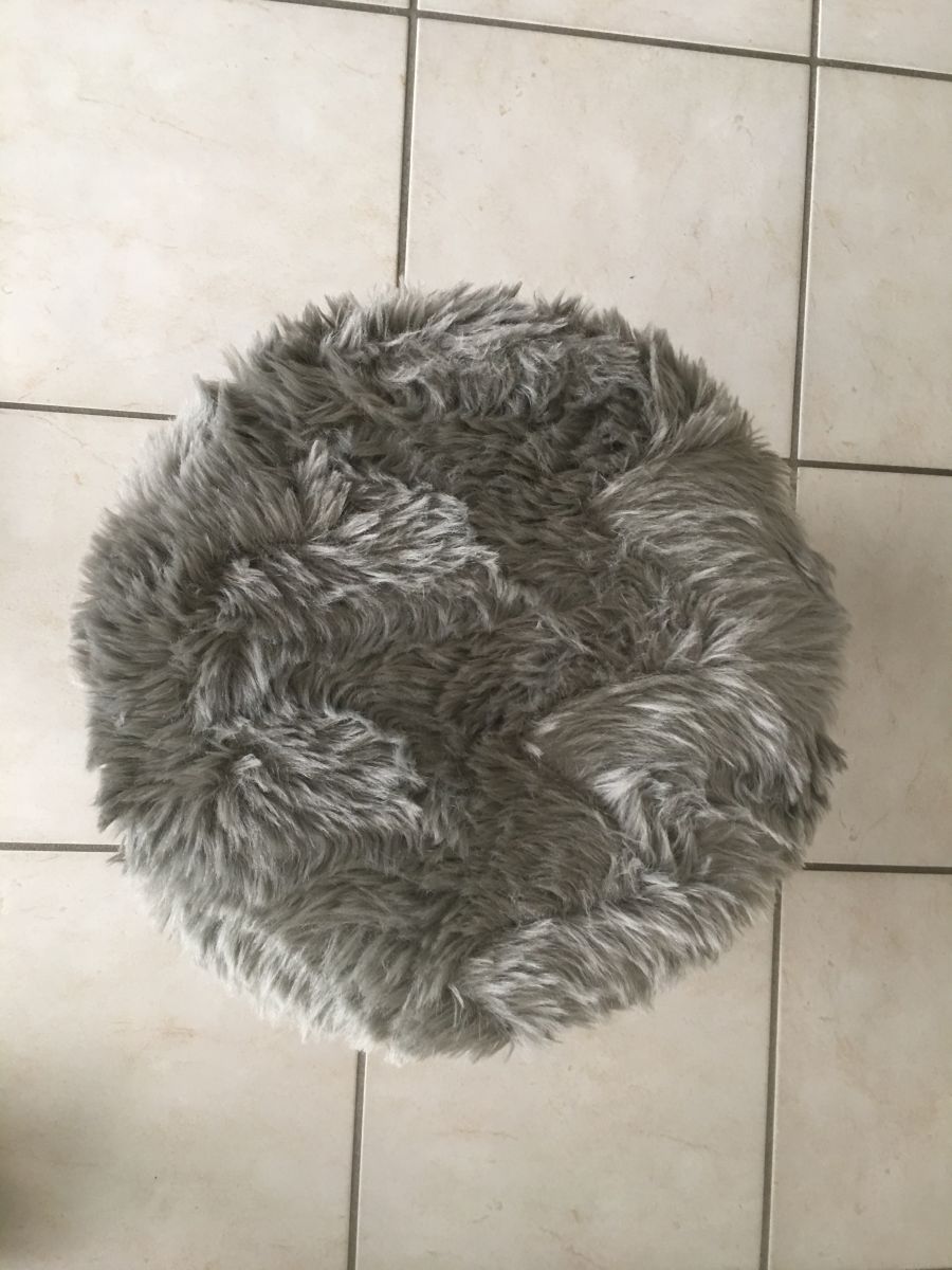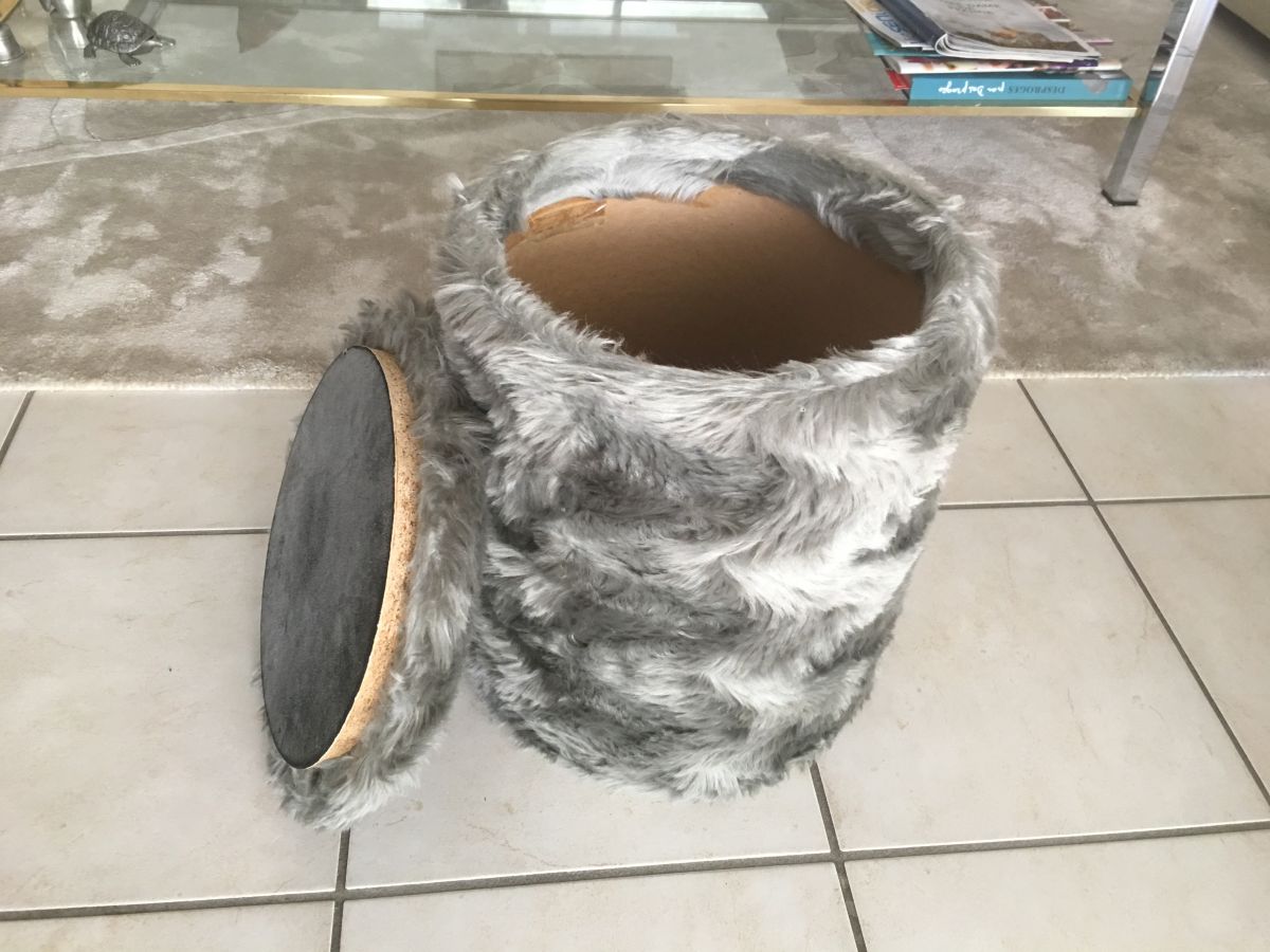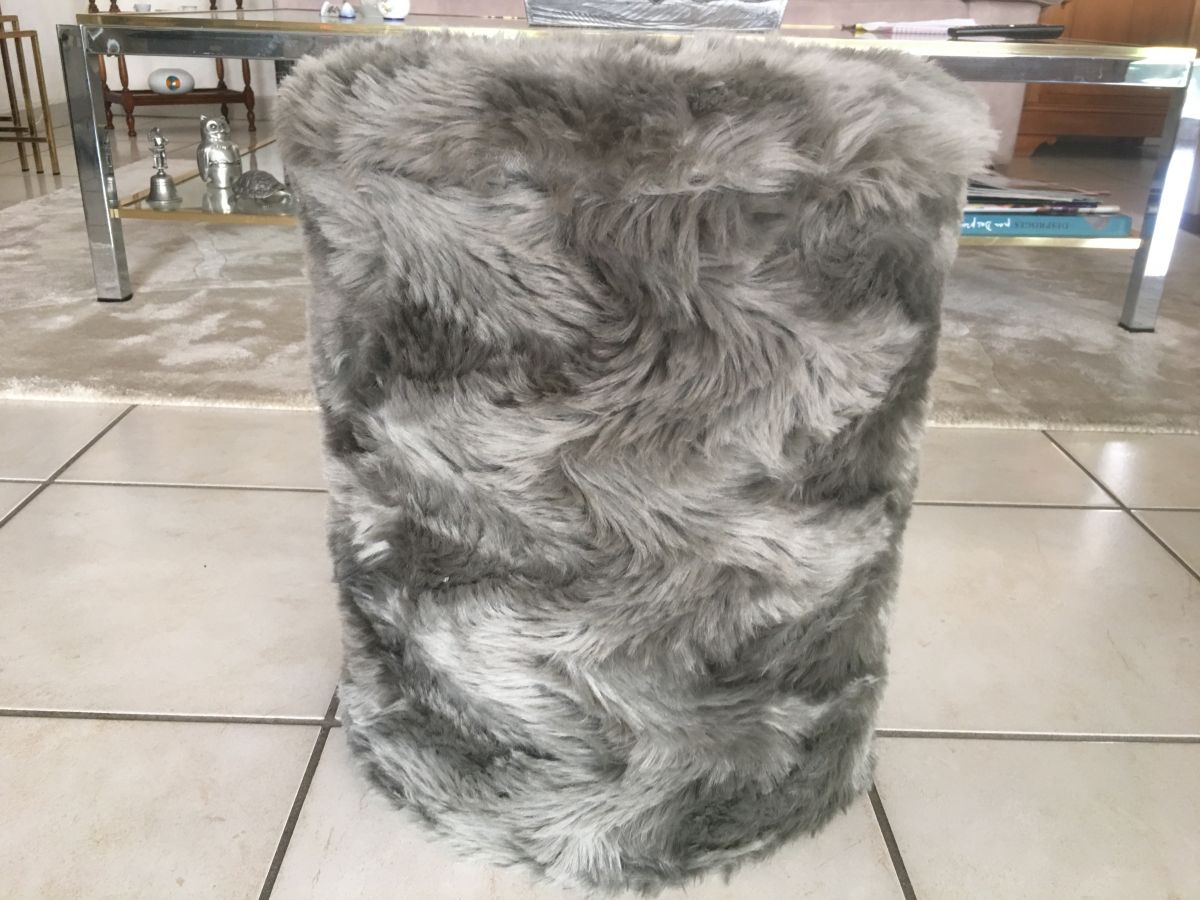 Pouf coffre en moumoute gris souris des années 70, hauteur 40cm, diamètre 35cm, bon état.