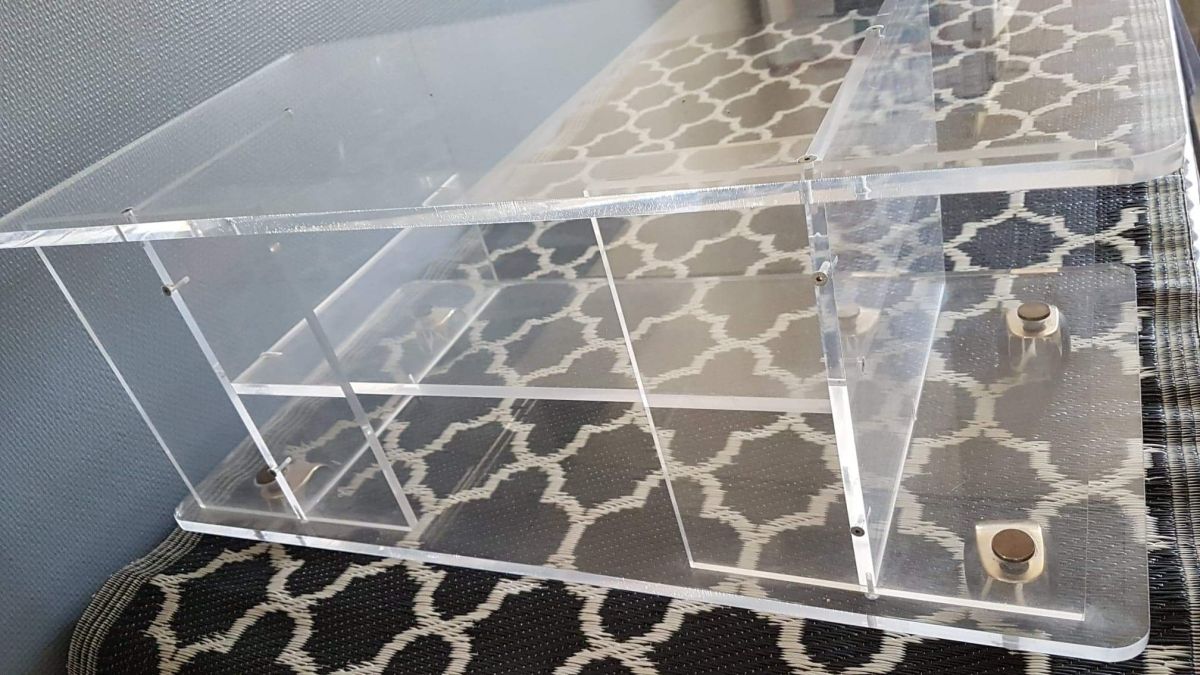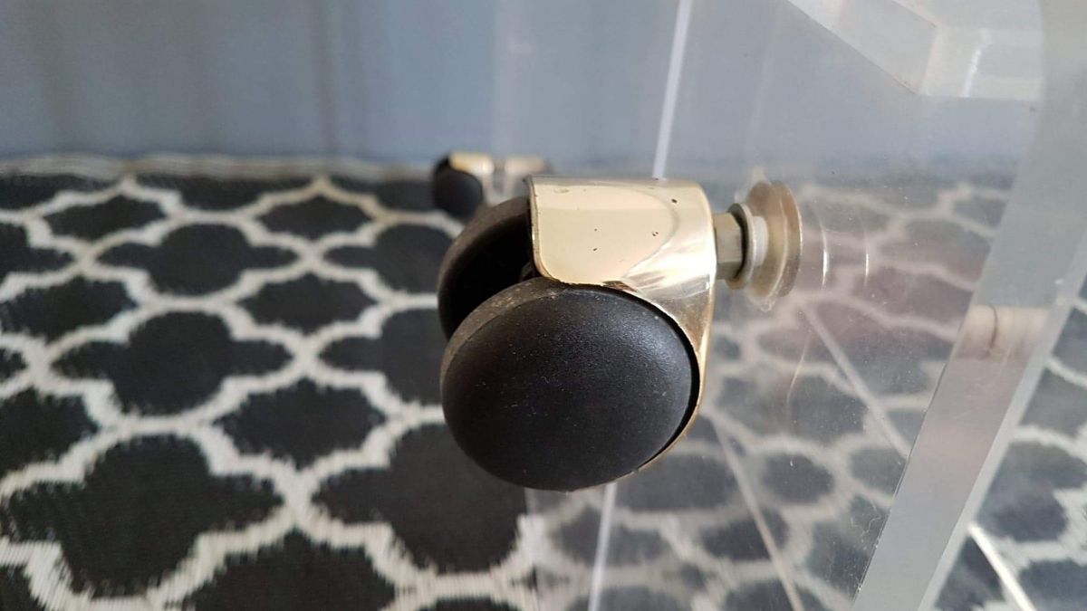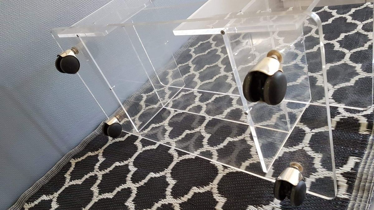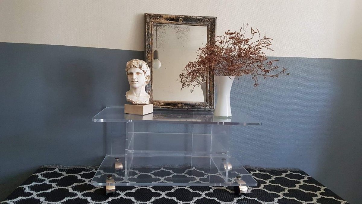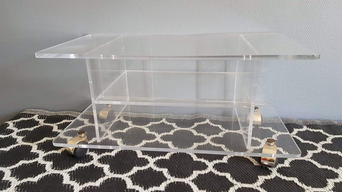 table plexiglas de marque Marais avec roulettes dorées années 70
