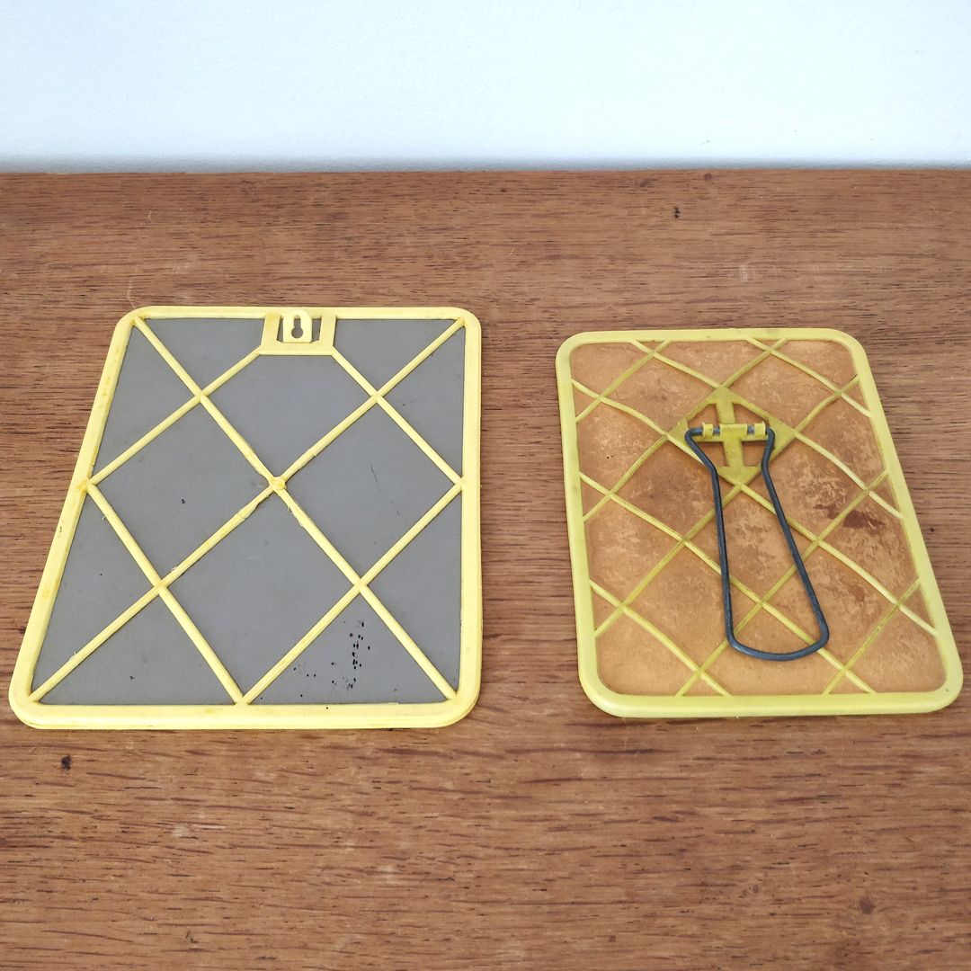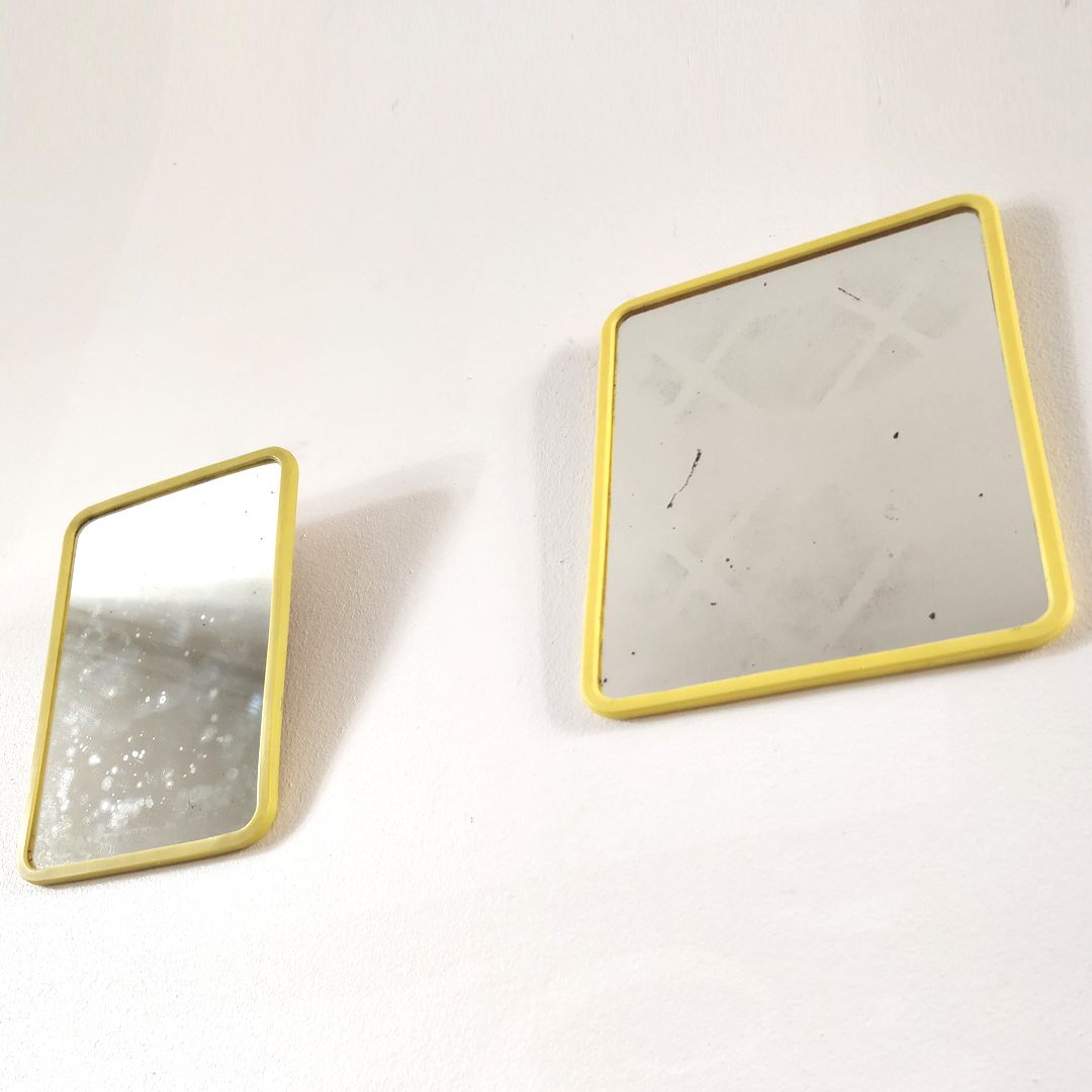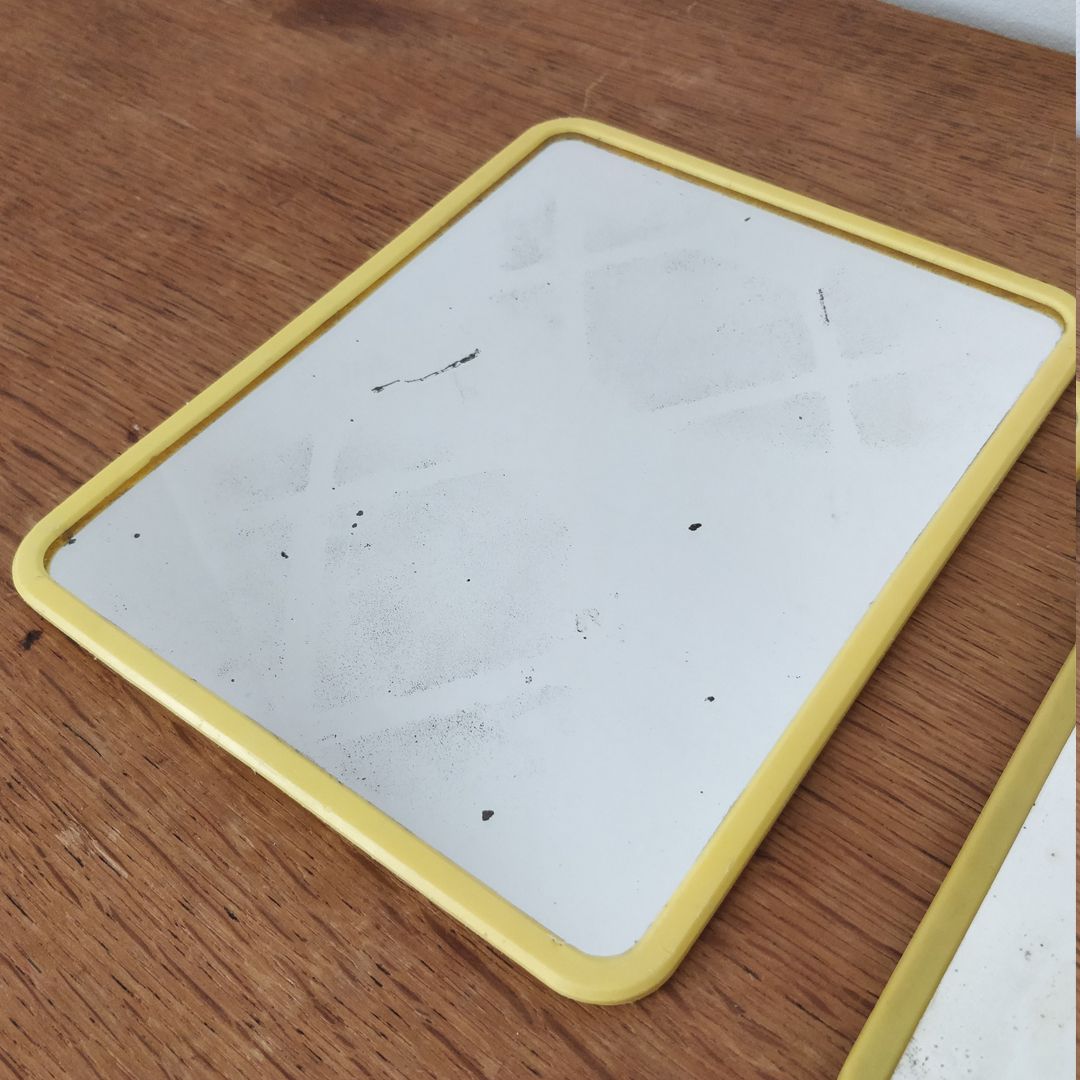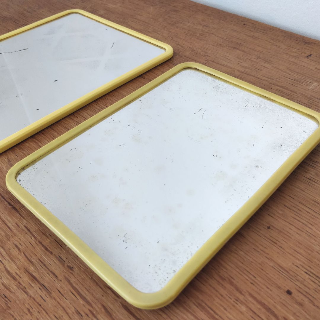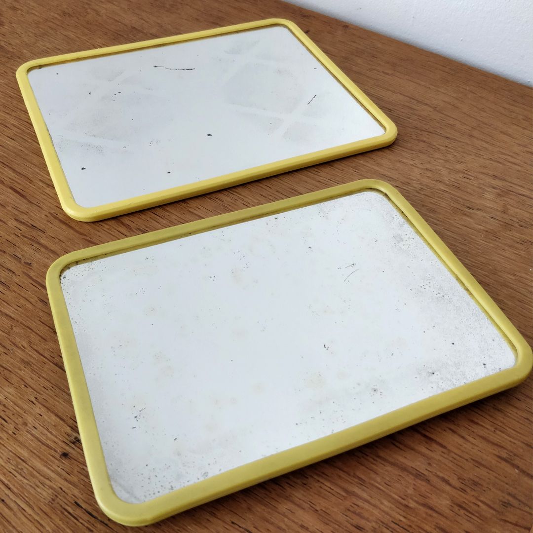 Duo miroir de coiffeur barbier des années 60. Contour plastique jaune. Bel état , Glaces patinées et piquées par le temps. Dim 20par 14cm et 22 par 17cm.