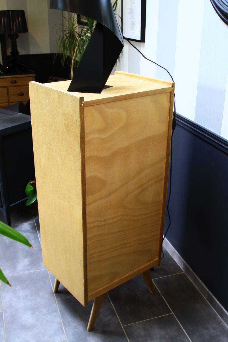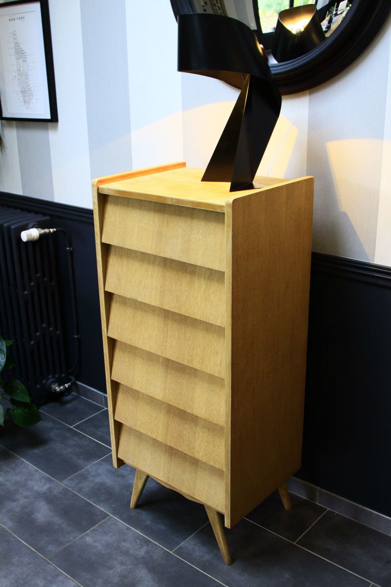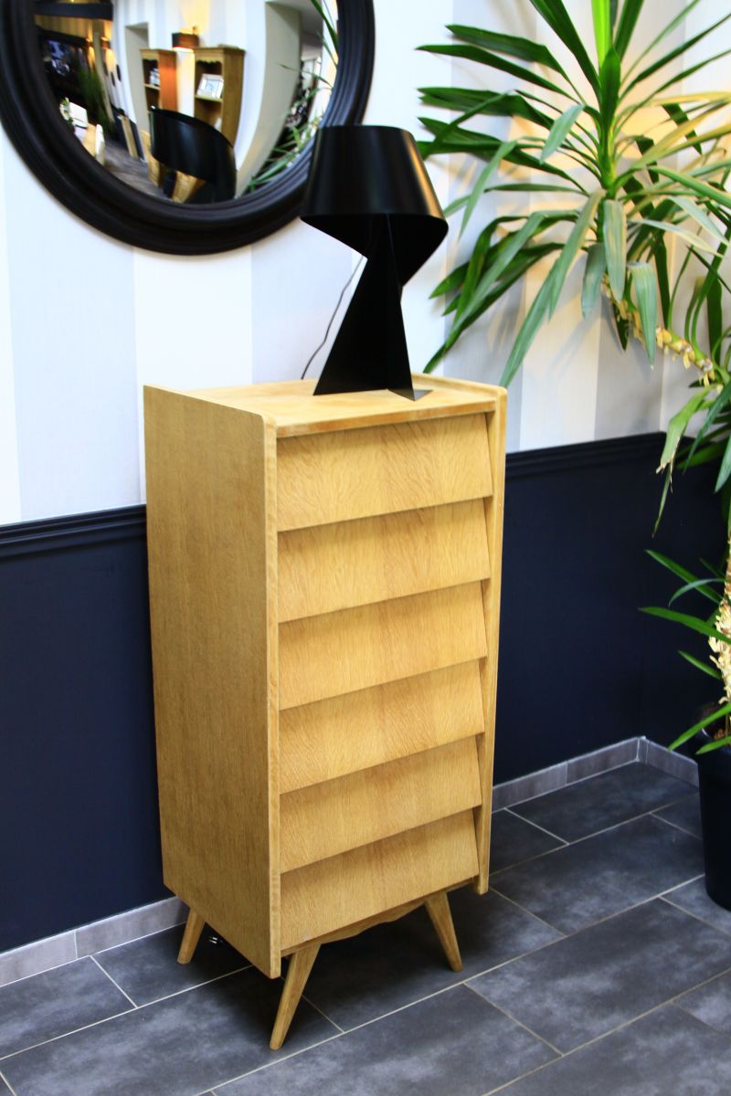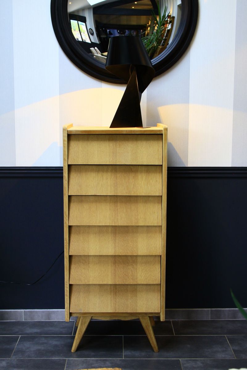 Très beau chiffonnier vintage 60's en bois brut. Pied compas stables avec 6 tiroirs coulissant parfaitement.