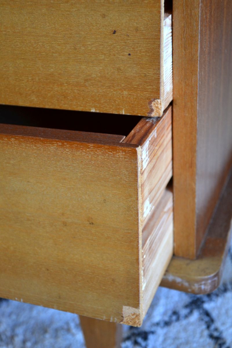 Le plaquage a sauté sur 2 tiroirs mais très peu et plateau à poncer.