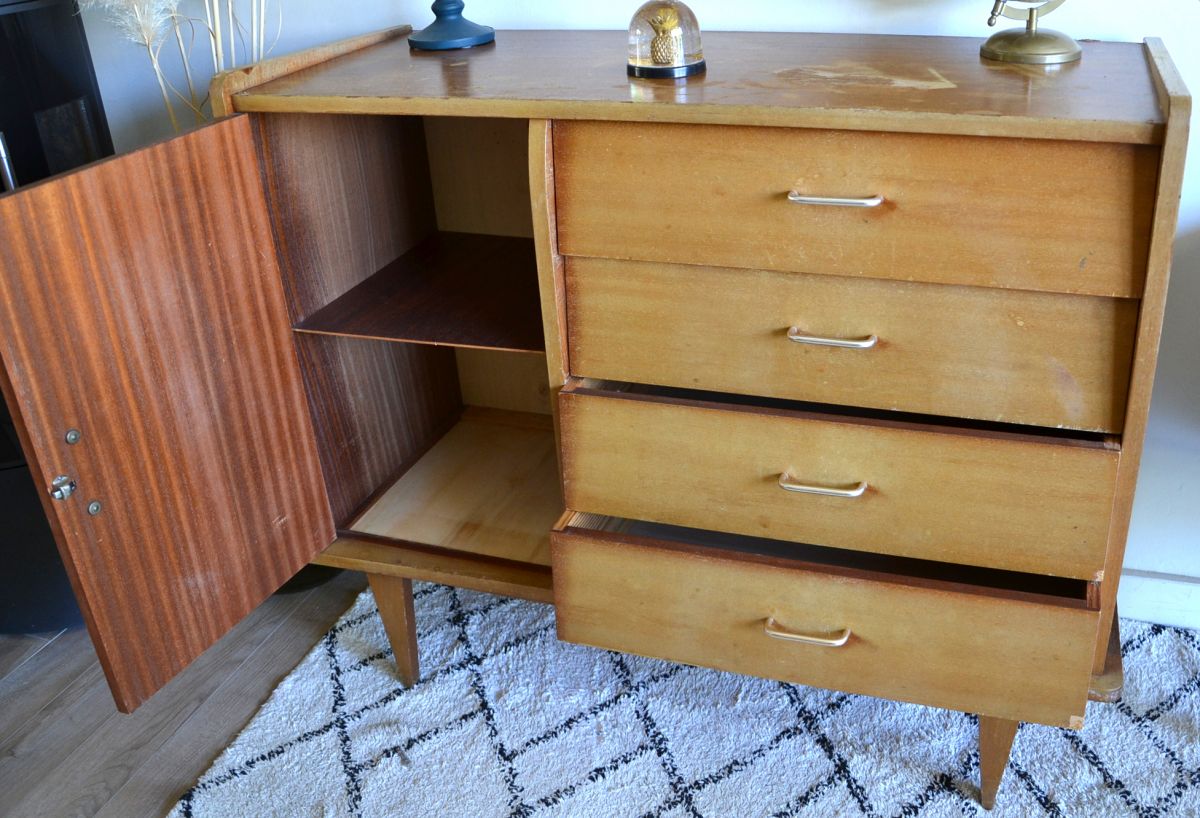 Commode ou enfilade vintage dans son jus, vraiment jolie avec ses courbes arrondis et originale avec son petit placard sur la gauche et ses 4 tiroirs décalés.