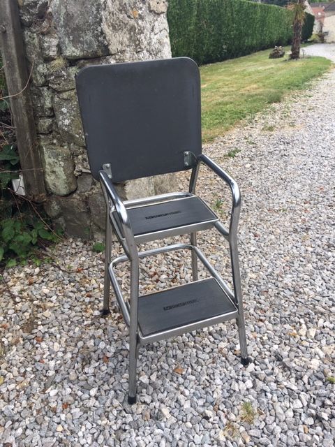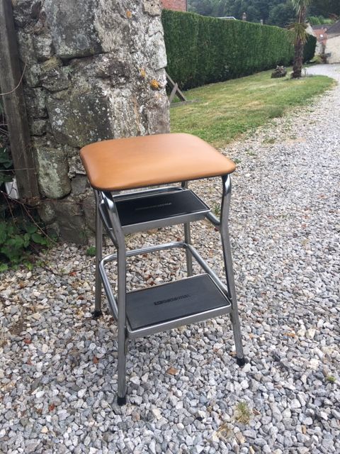 Tabouret escabeau vintage, dessus imitation cuir marin, marches anti dérapante, structure acier chromé, d’origine, très bon état.