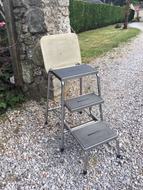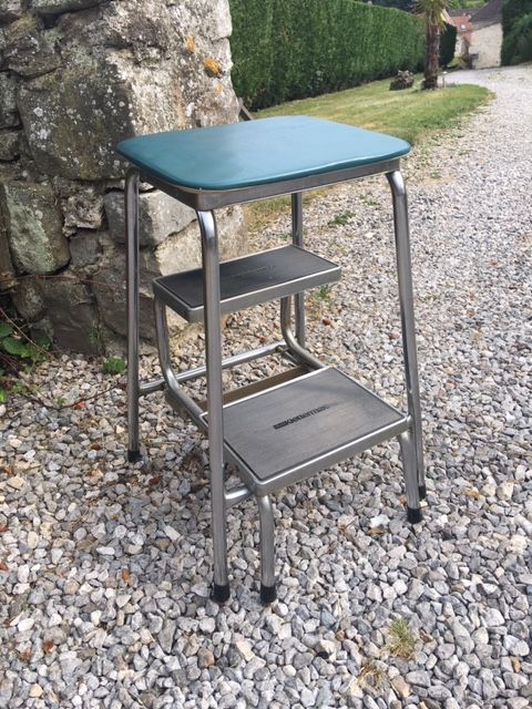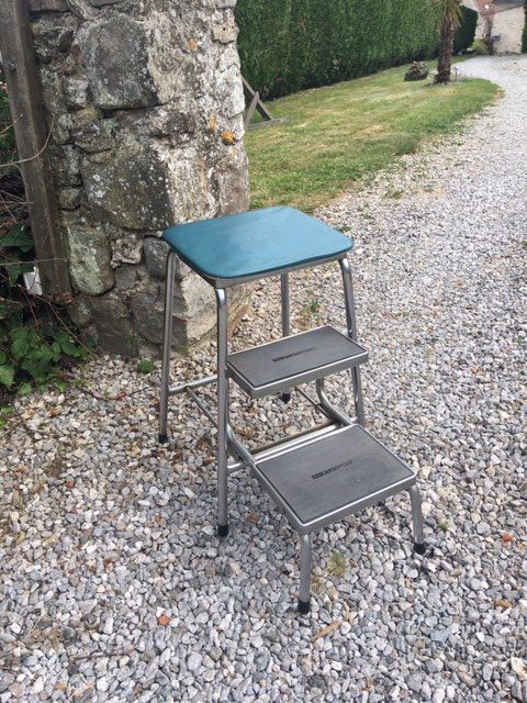 Tabouret escabeau vintage simili cuir bleu, marche anti-dérapante bon état.