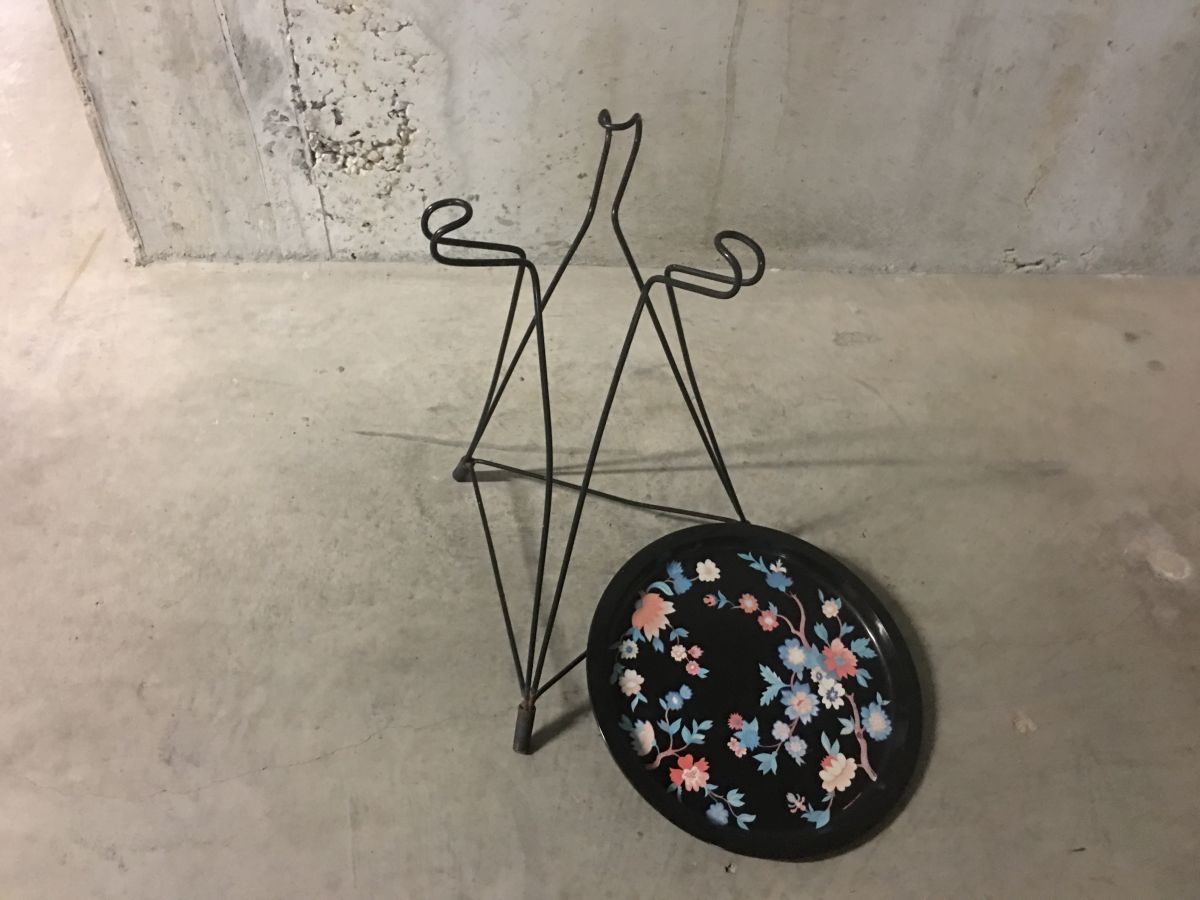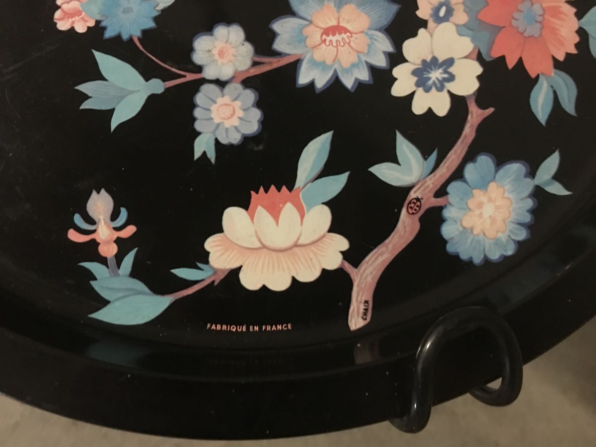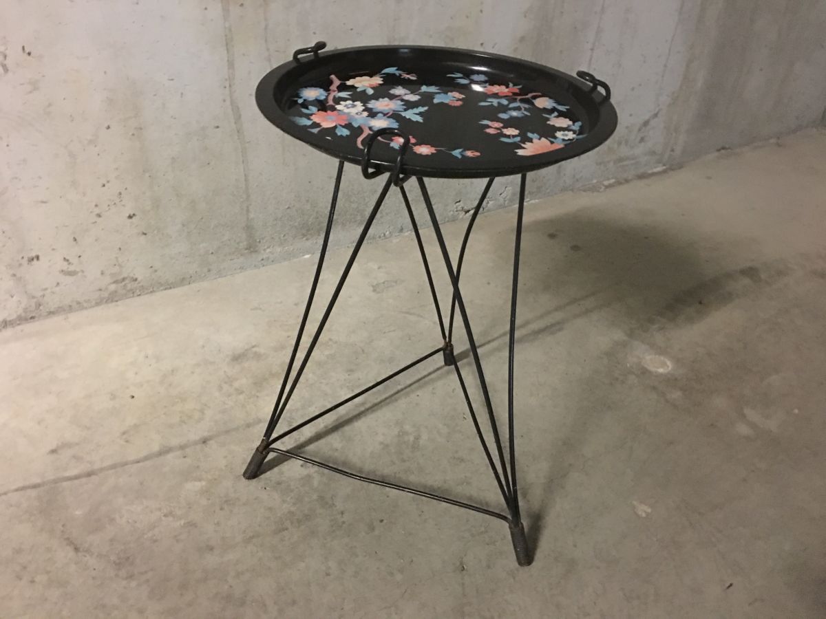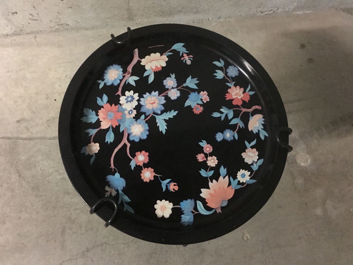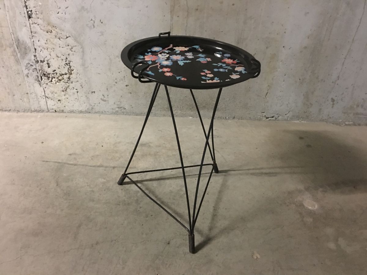 Petit guéridon/table d’appoint tripode des années 50 en métal tubulaire noir et plateau en métal noir peint, le plateau de service est amovible, décor floral de Chaix, hauteur 48cm, diamètre du plateau 33cm, quelques très légères traces d’usage normal sur le piétement (voir photos), bon état.