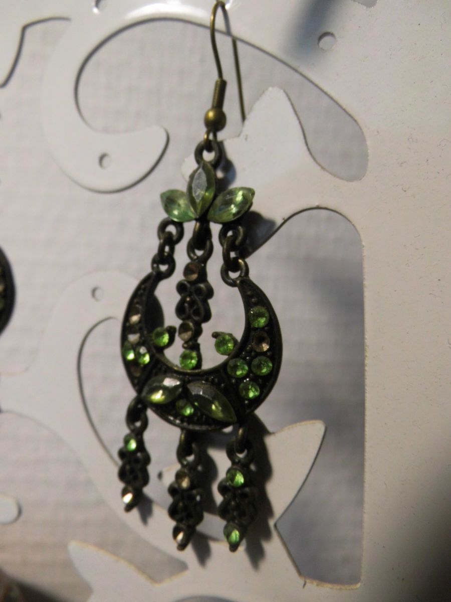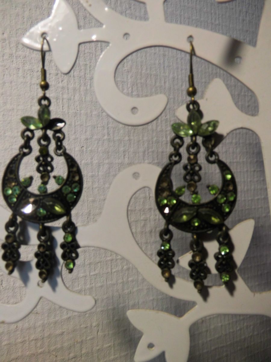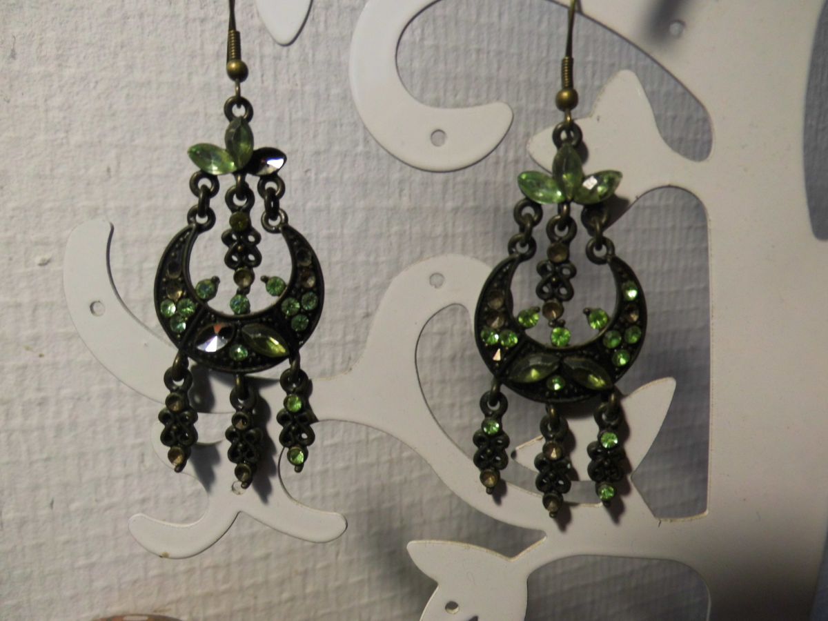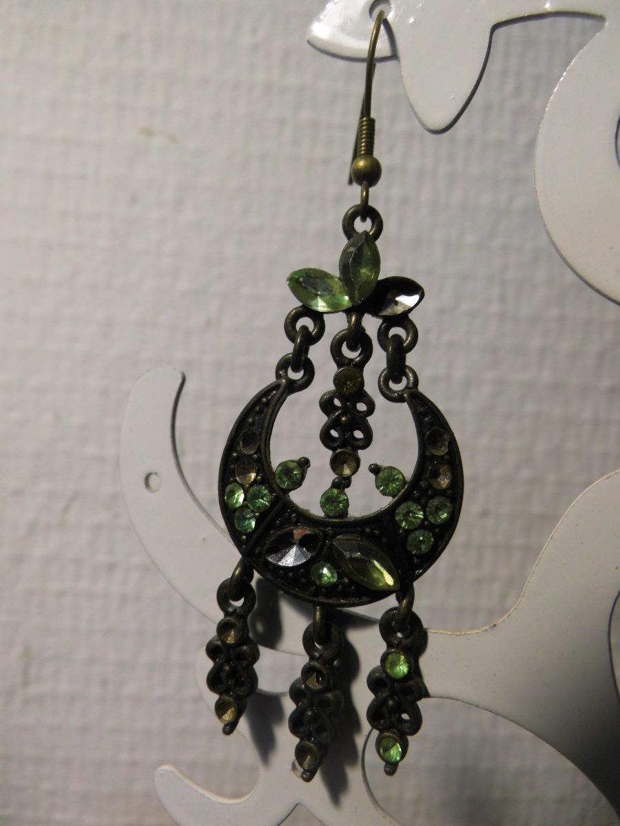Boucles d'oreilles pendantes vert d'eau et bronze, en métal, et perles de verre.