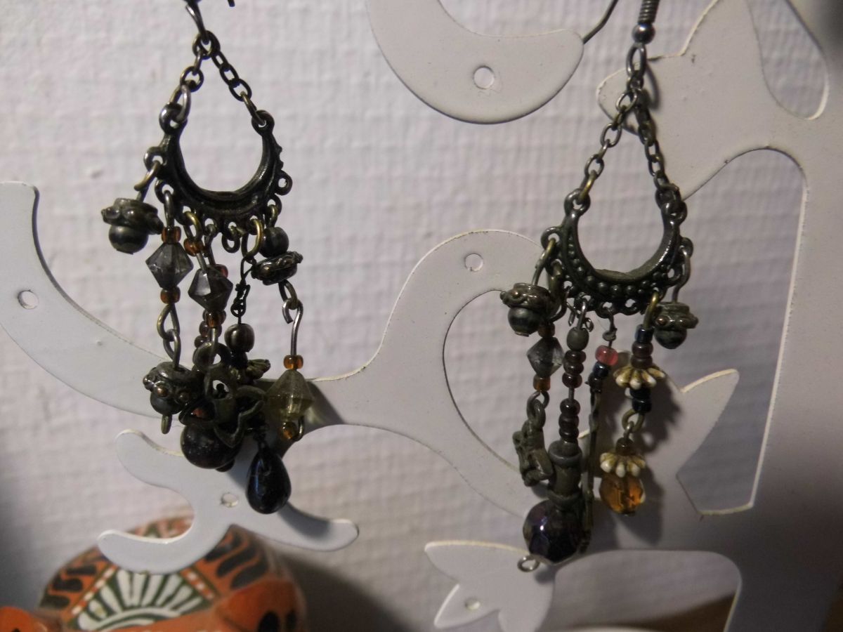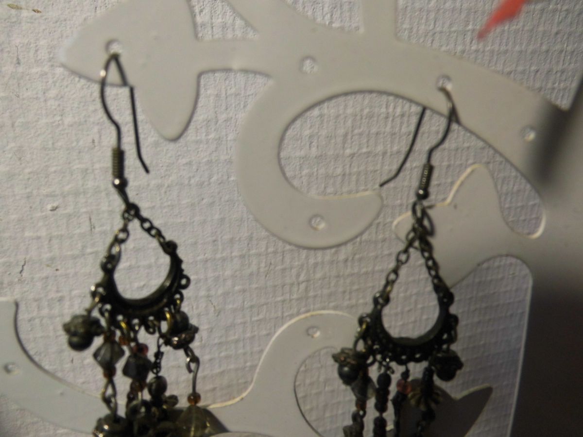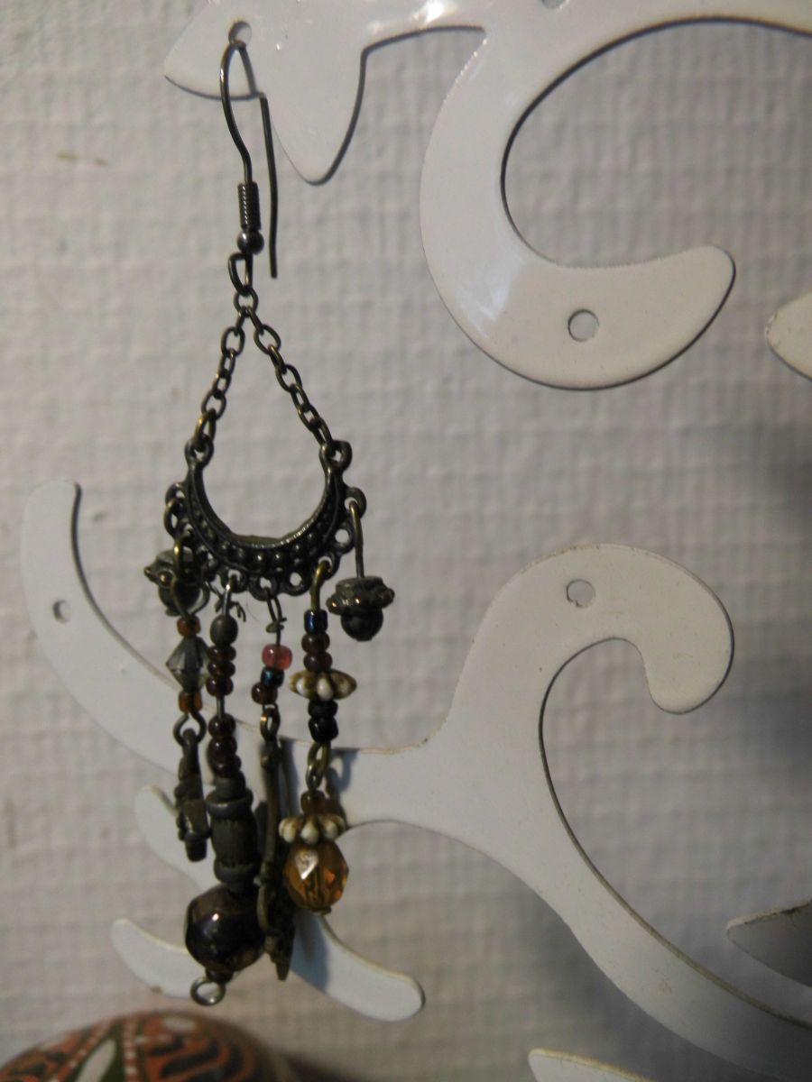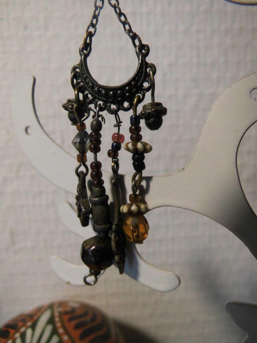 Boucles d'oreilles pendantes prune, brun et bronze, en métal, perles de métal et de verre. DIY dans les années 70 avec des perles ramenées de voyage... toute une histoire... Il s'agit d'un modèle unique.