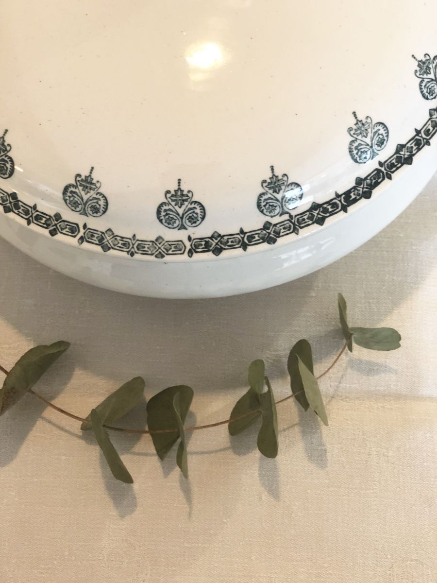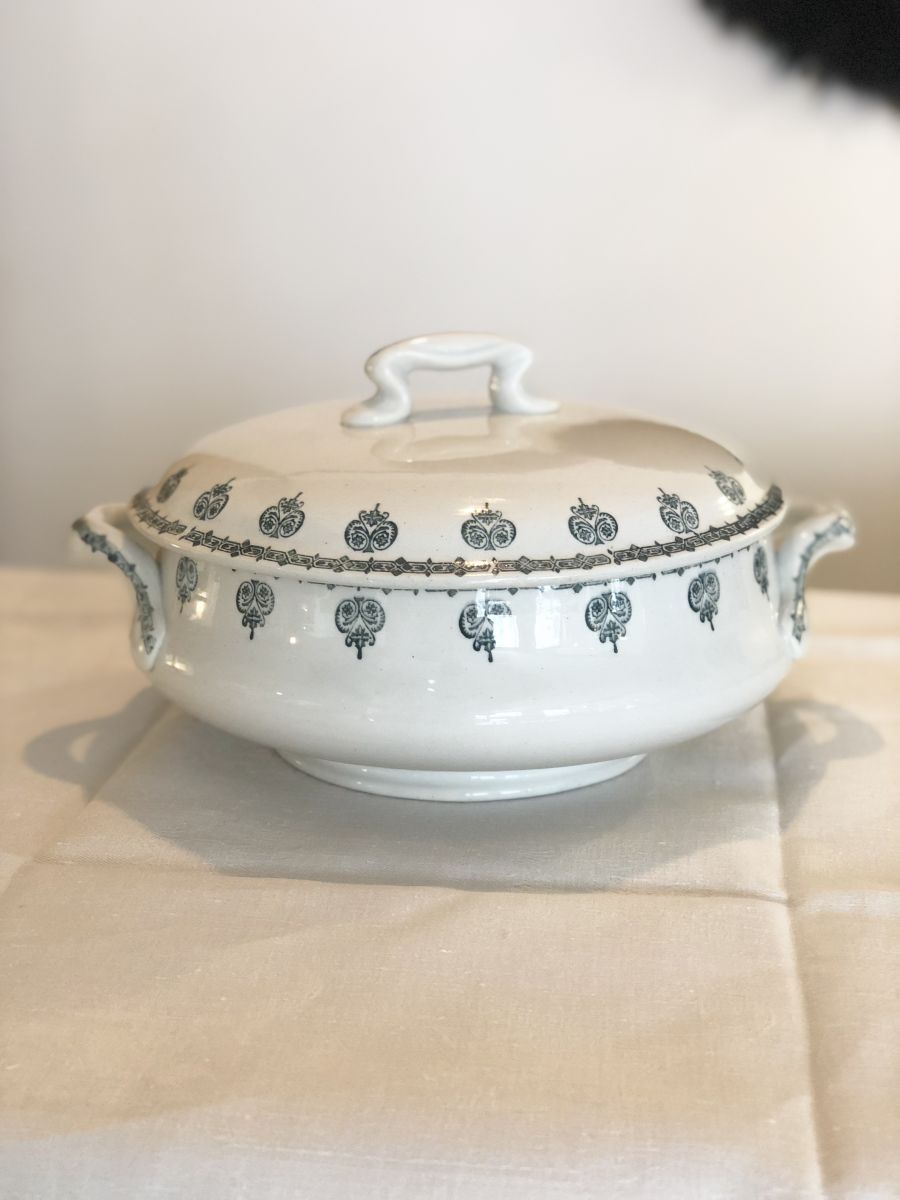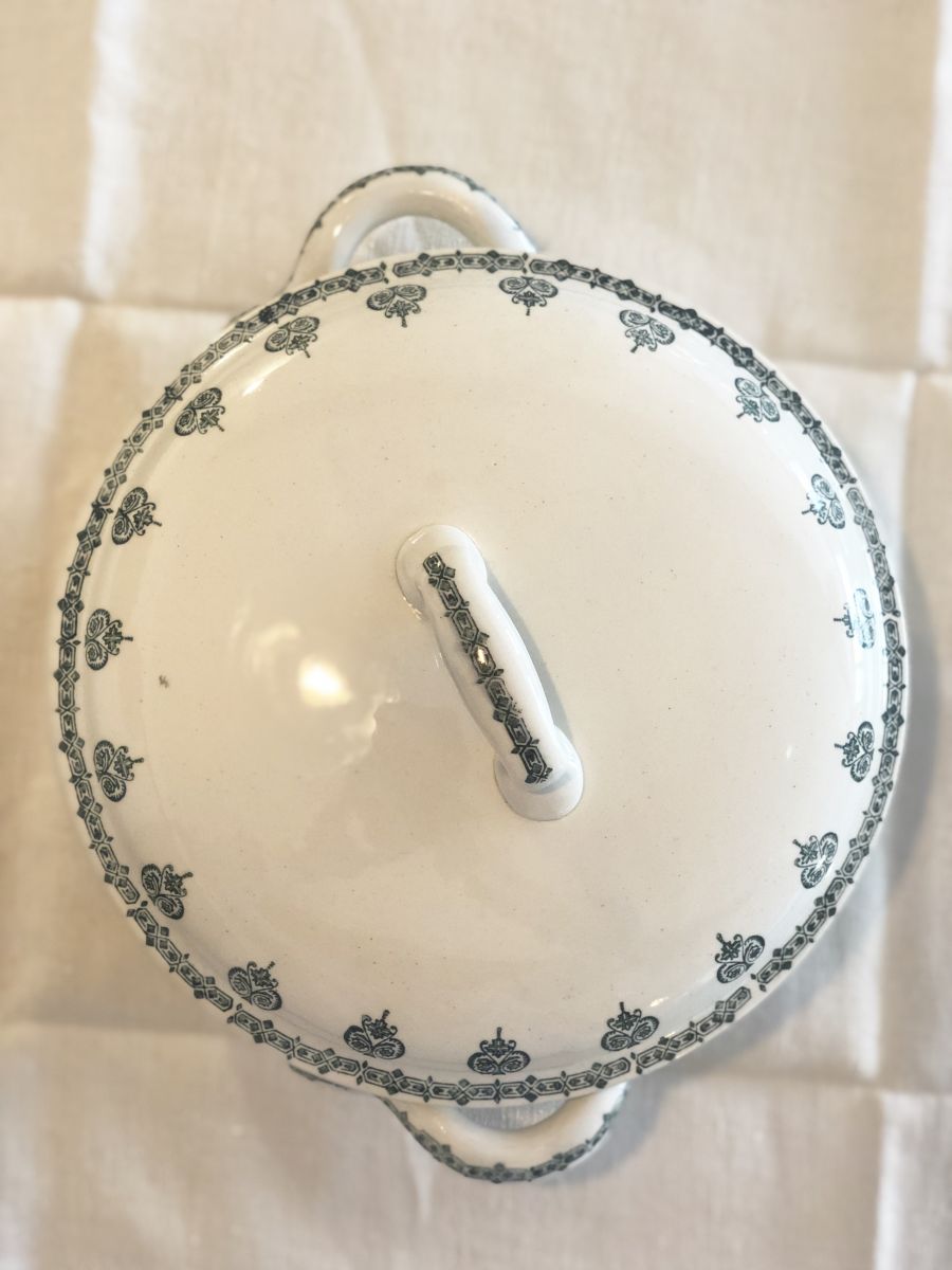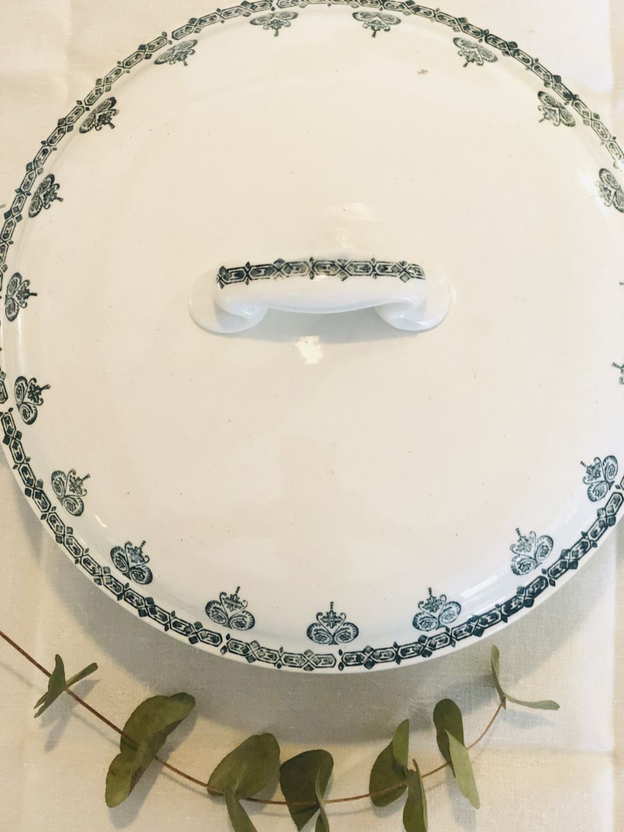 Soupiere de la nouvelle usine de céramique du Nord Saint Armand décoration feuillage vert.