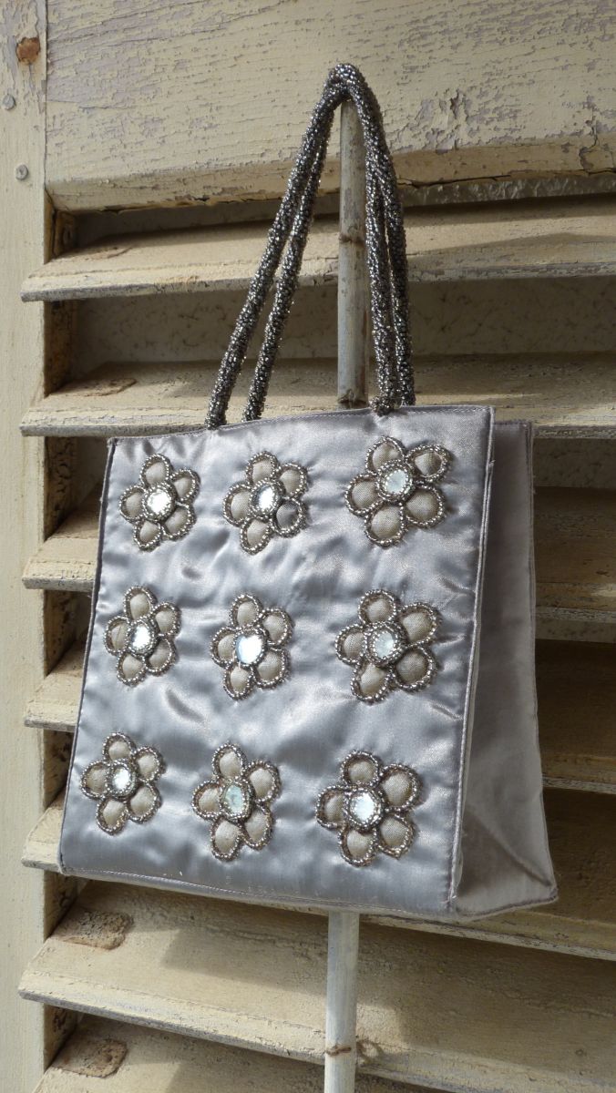 En soie grise délicate, il est orné de marguerites (pétales en perles et miroir au niveau du coeur). Les anses sont parées de petites perles grises réfléchissant la lumière.