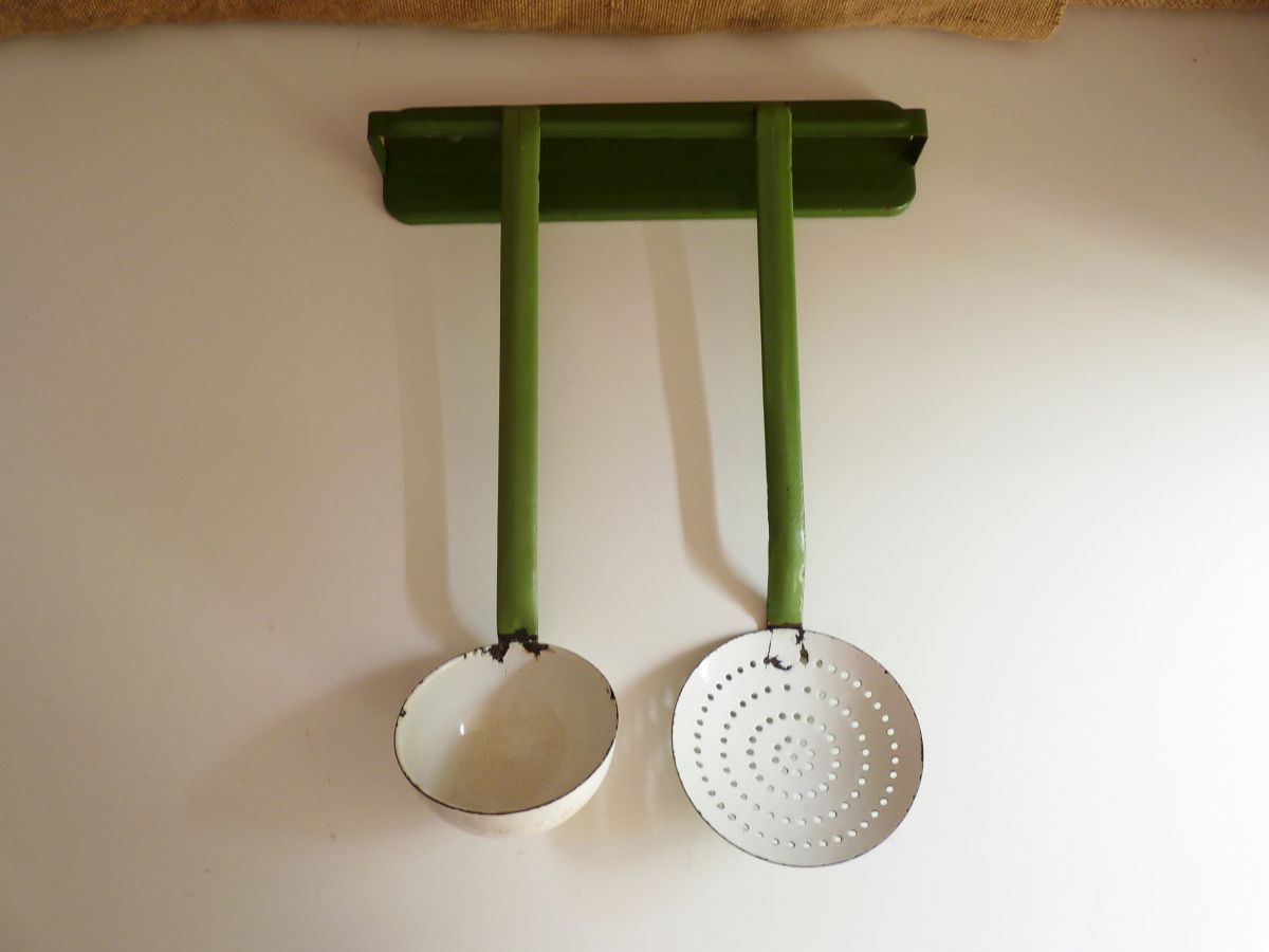 Lot de 2 ustensiles, louche et écumoire, cuisine des années 50 avec leur accroche murale.