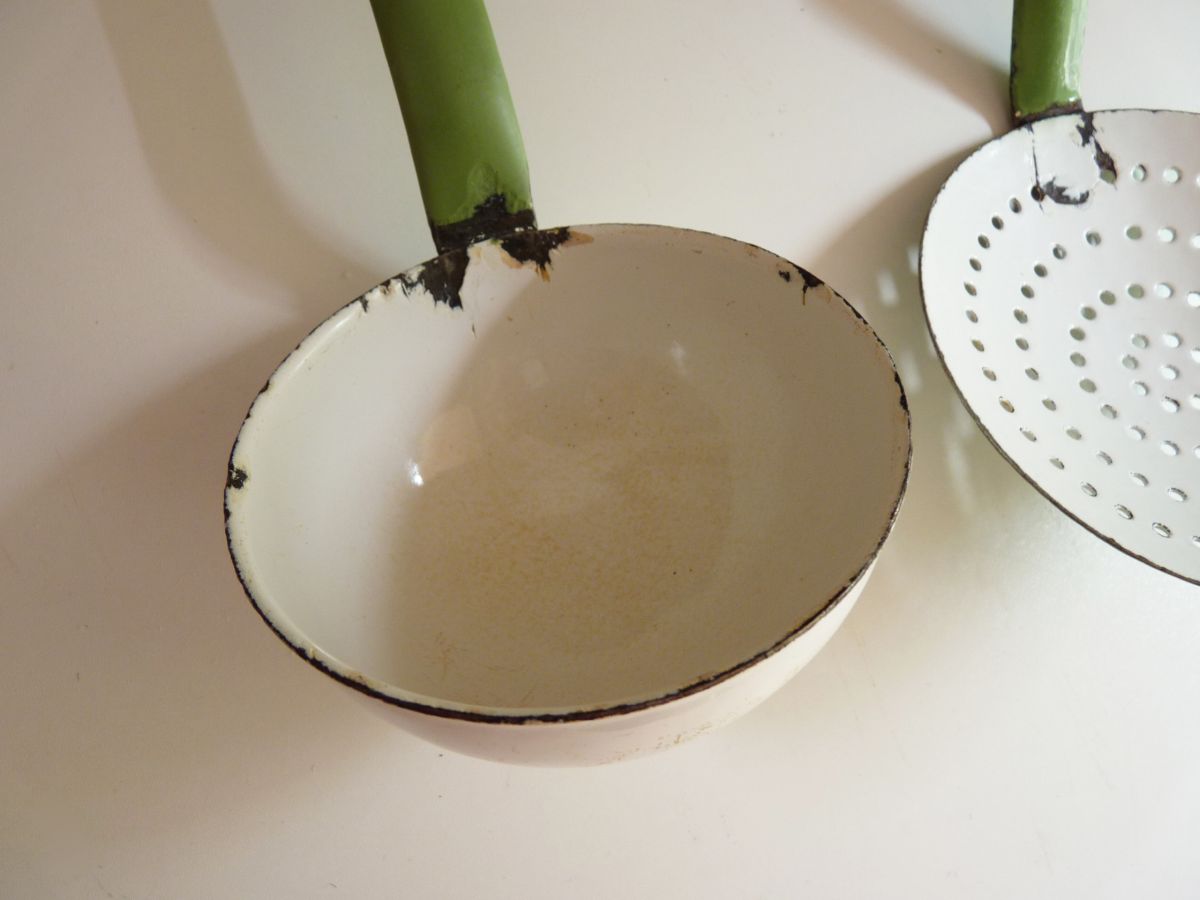 Louche et écumoire émaillés blanche et verte, avec accroche