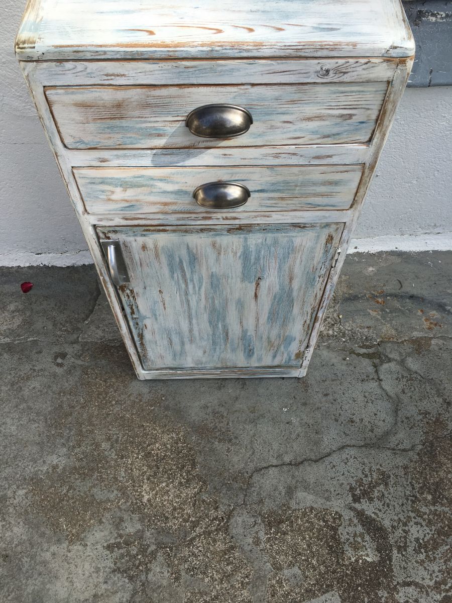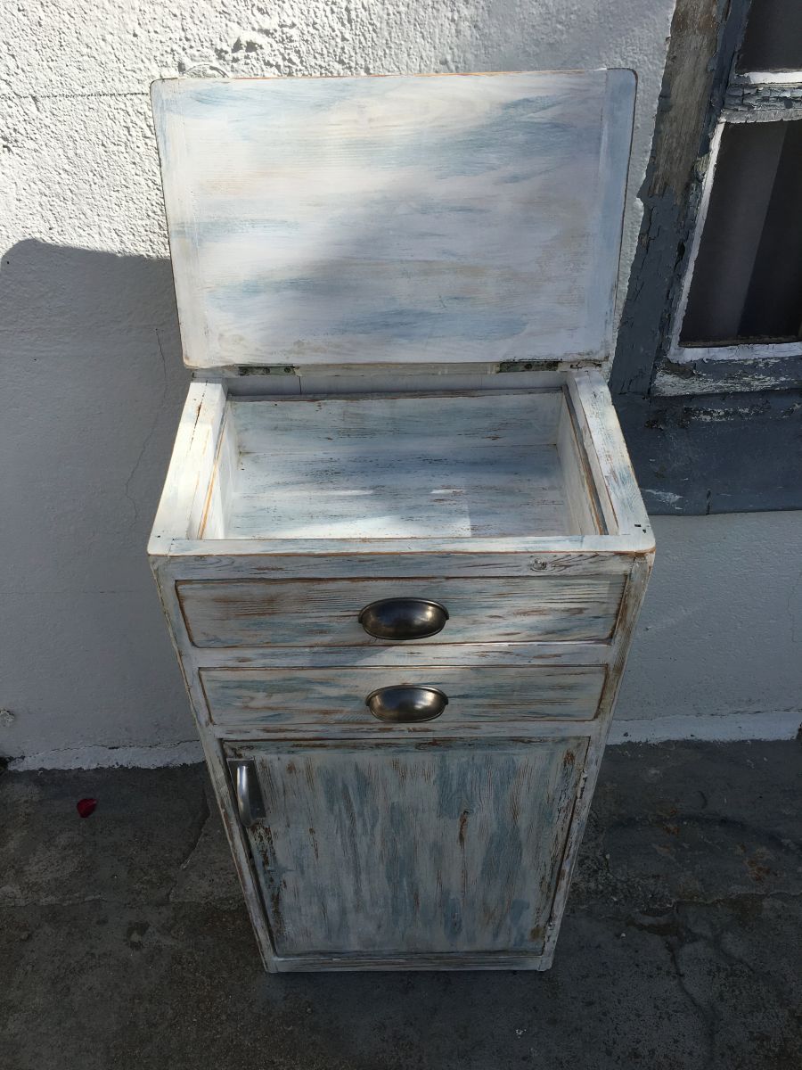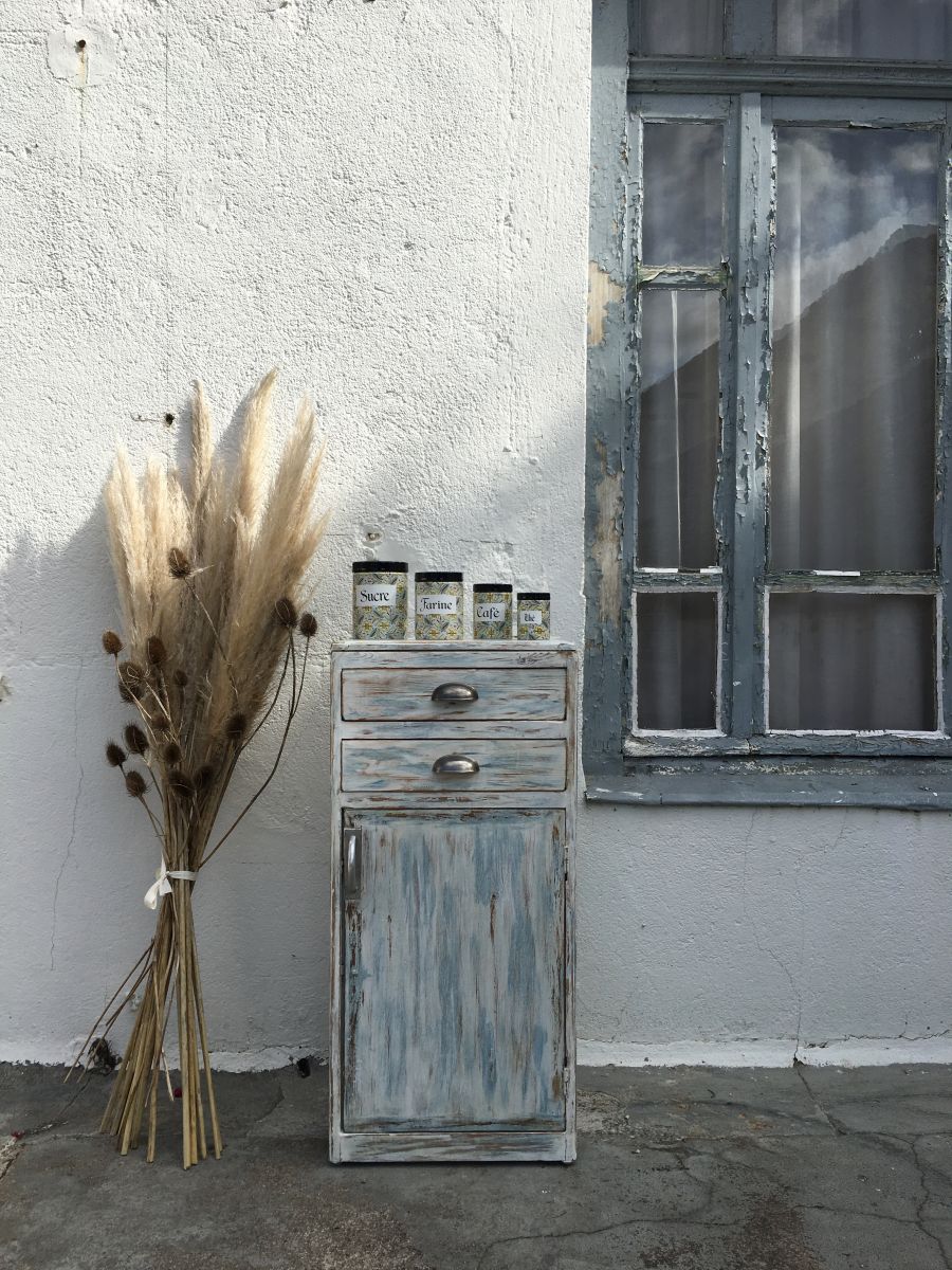 Ce confiturier est atypique de part sa physionomie, il possède deux tiroirs de rangement et un plateau avec abattant. Nous l'avons complètement relooké en le patinant pour lui donner un aspect vieillit par le temps.