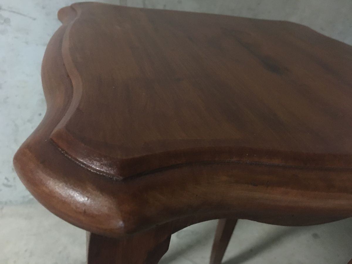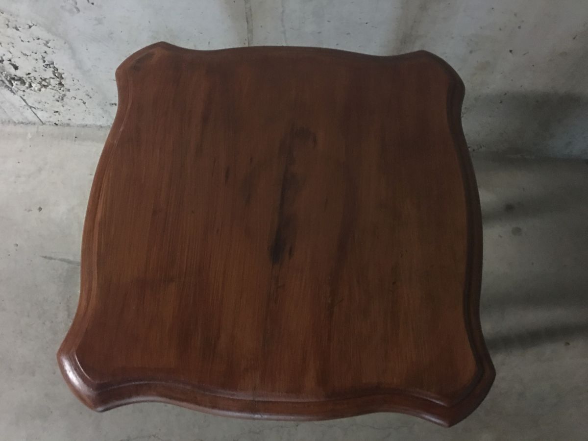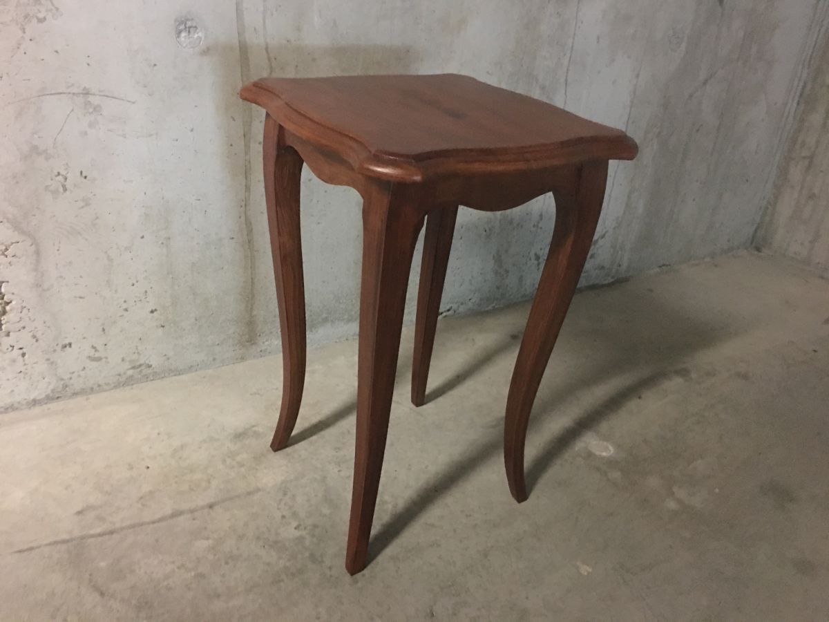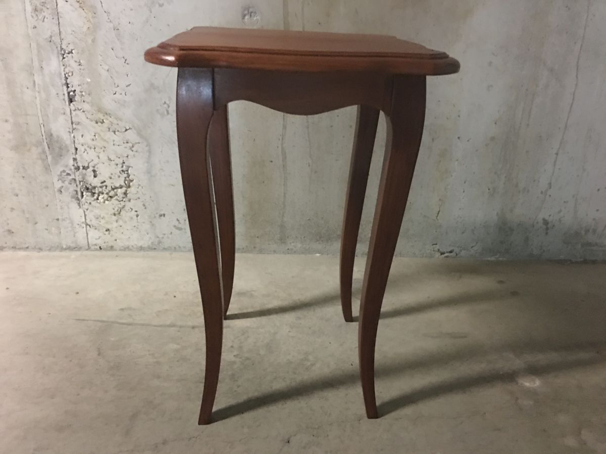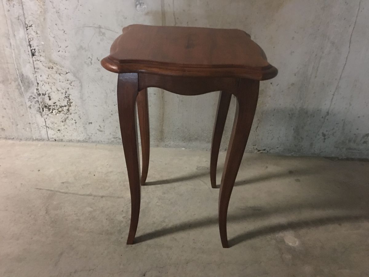 Très joli petit guéridon en bois massif de style Louis XV, entièrement poncé et reverni, peut également servir de table d’appoint ou de chevet, hauteur 50cm, plateau 40x40cm, bon état.