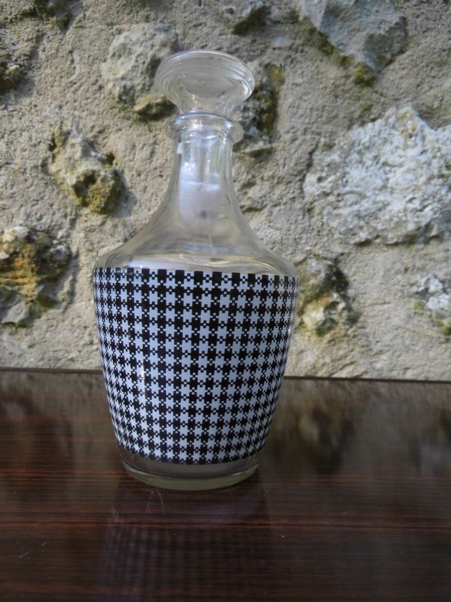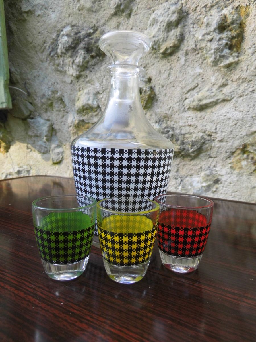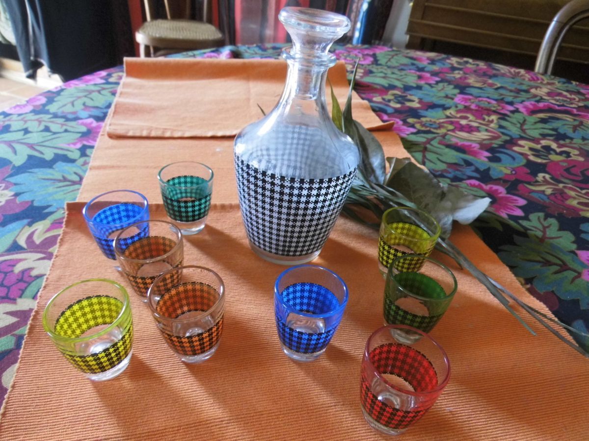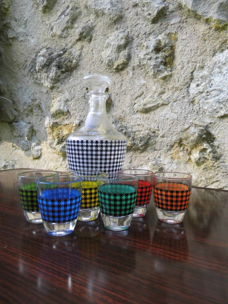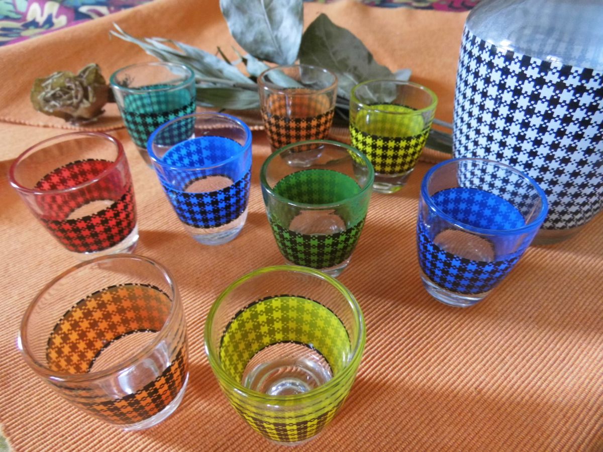 service à liqueur vichy (ou plutôt pied de poule) multicolore VINTAGE - années 60 composé d'une carafe avec son bouchon et de 9 verres de couleurs différentes - voir photos