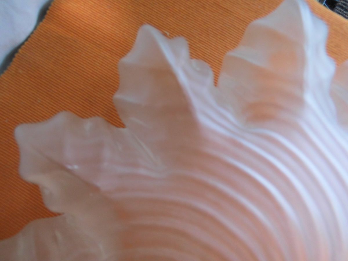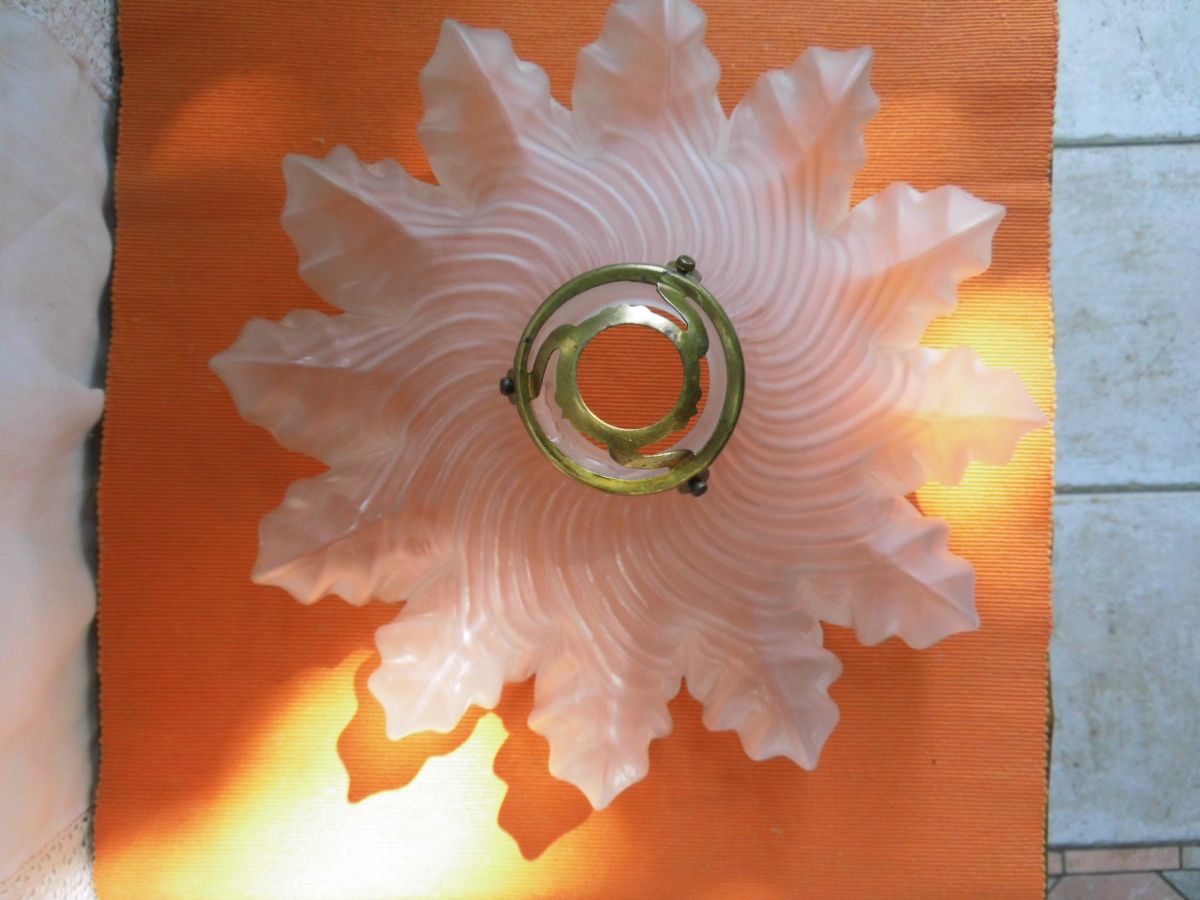 Abat jour 1900 en verre moulé opalescent, juponné en forme de feuilles et sa griffe en laiton, pour suspension simple ou de type "monte et descend".