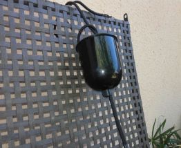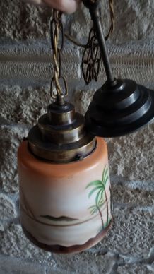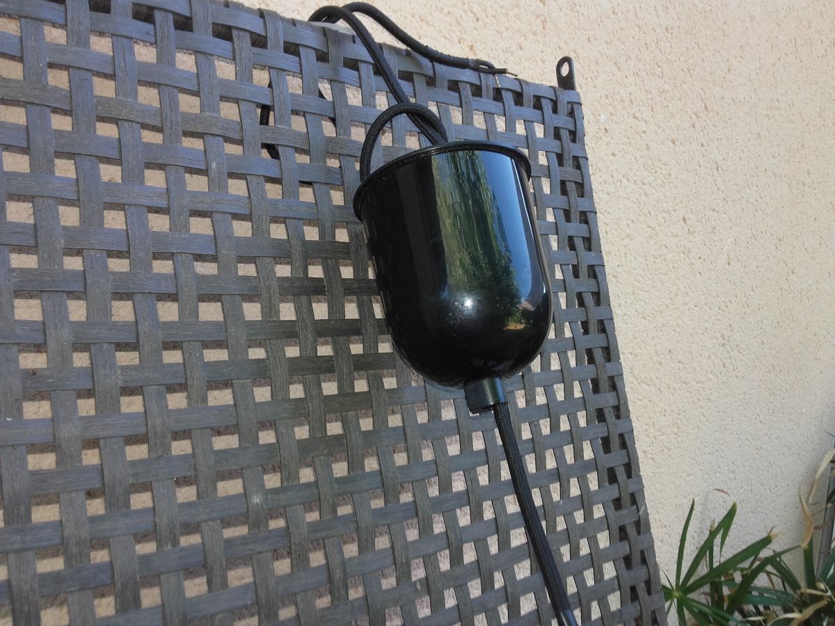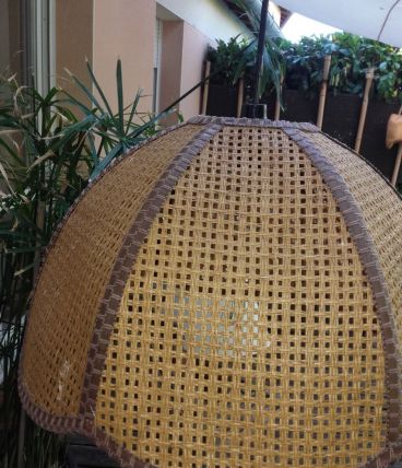 Suspension en rotin..avec des liserai en cuir entre chaque partie. .le goulot a été remplacé récemment, manque plus a y mettre une ampoule et l'installer.