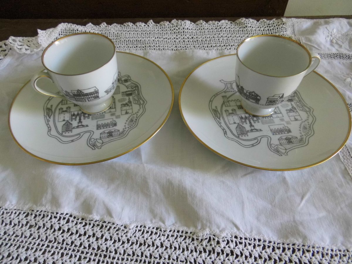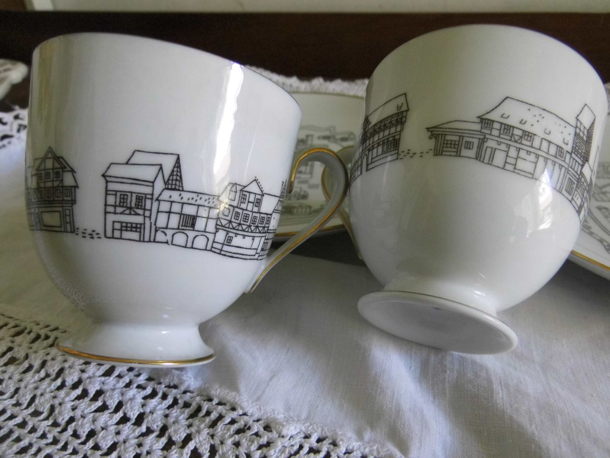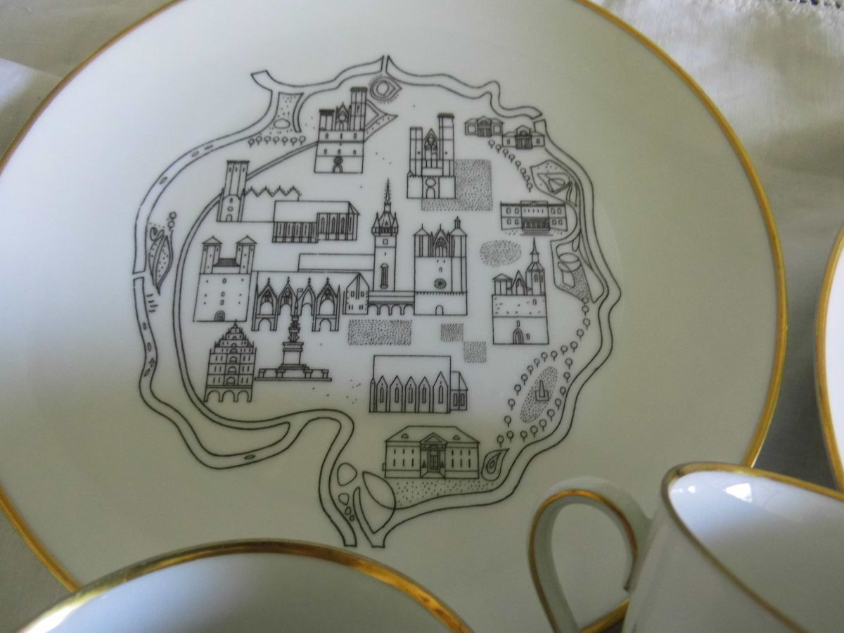 La porcelaine est de couleur crème avec liserés or très bien conservés. Les motifs sont ceux de monuments et bâtiments historiques et traditionnels stylisés, dessinés au trait noir.