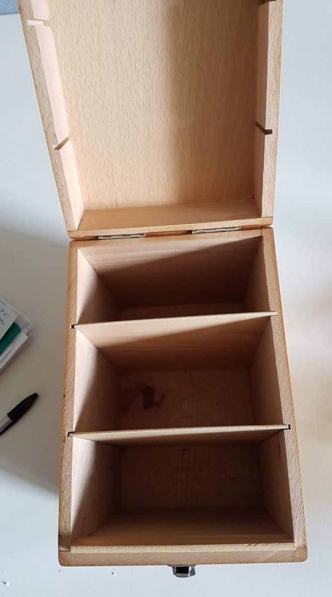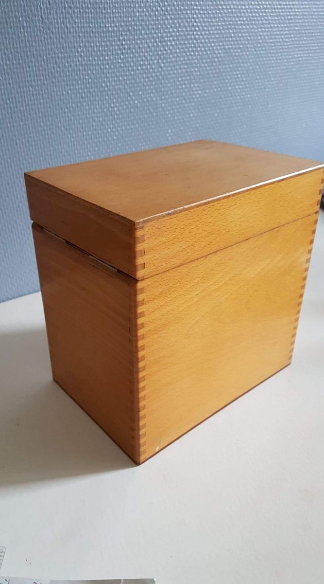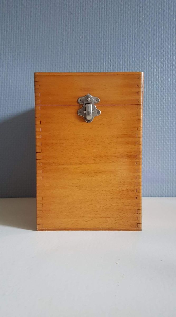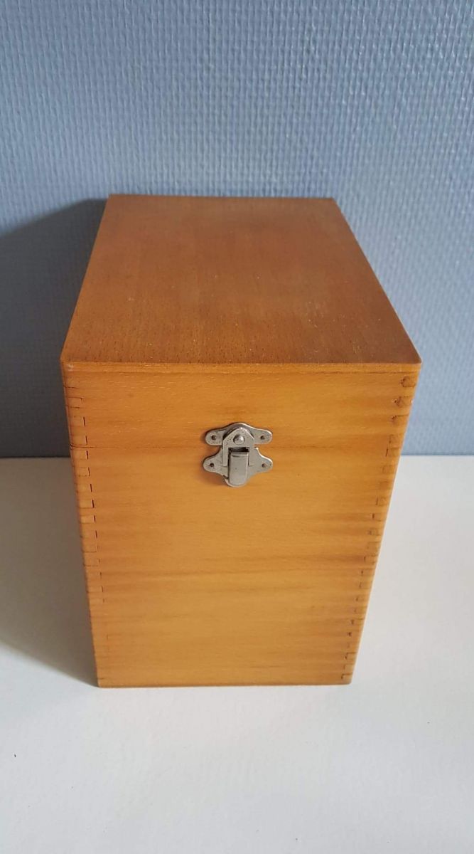 boîte en bois verni vintage, rangement de fiches 3 compartiments.