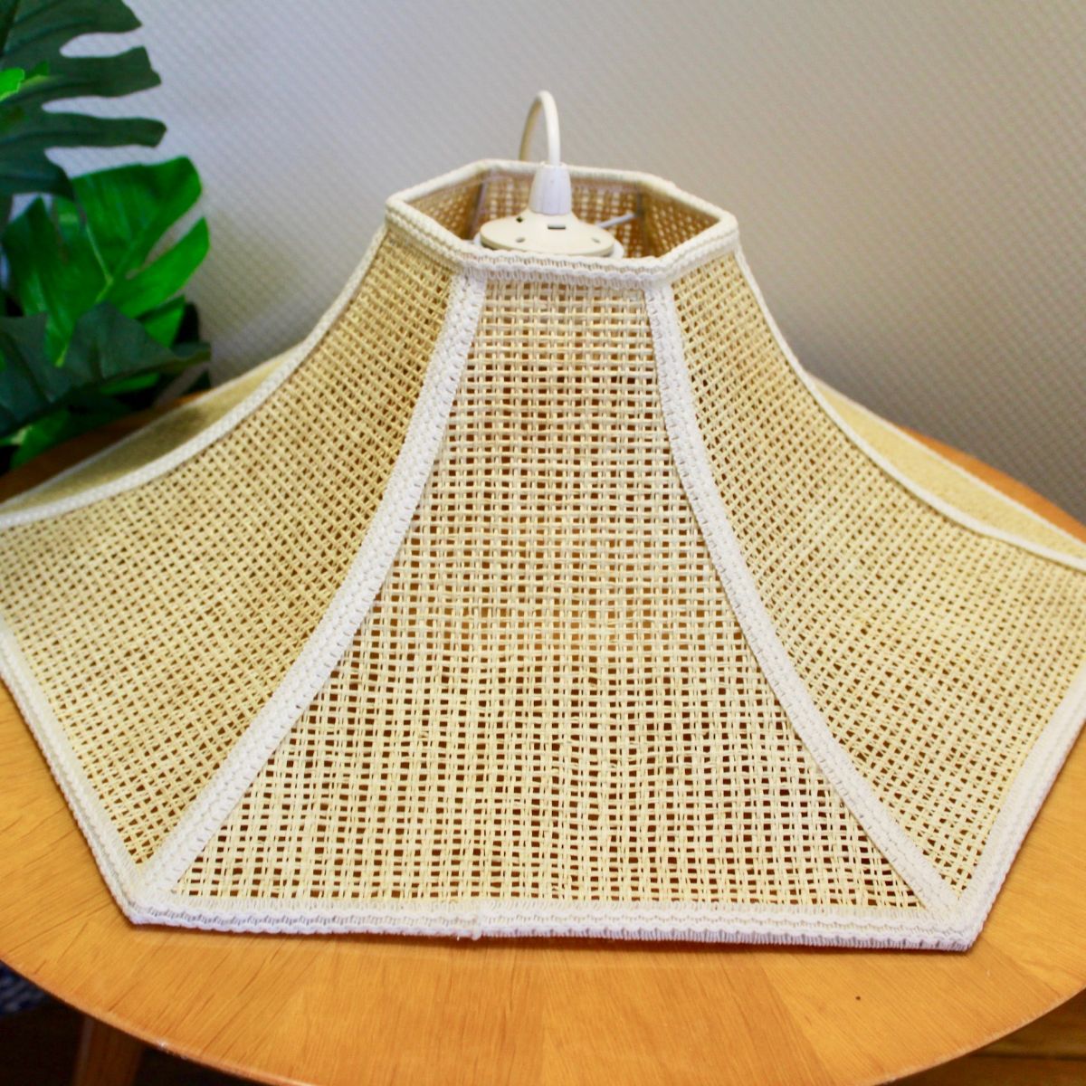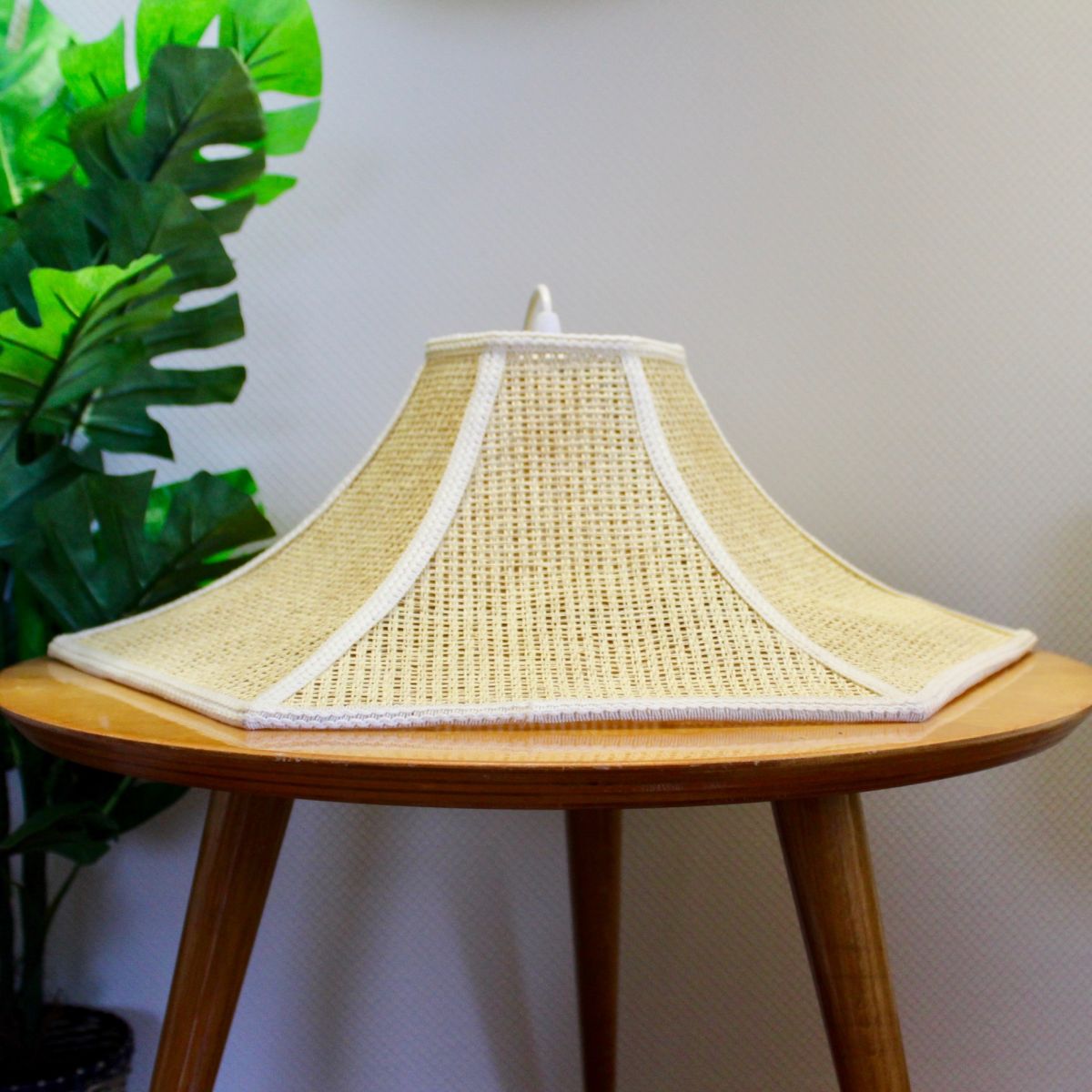 Magnifique et grande suspension bicolore en rotin raphia et métal travaillée avec un galon en passementerie blanc crème des années 1960 1970. En excellent état de conservation, elle donnera une touche vintage à votre décoration et se mariera parfaitement avec les couleurs et matières naturelles pour un intérieur bohème éclectique chic. Du plus bel effet une fois installée. Elle est électrifiée et fonctionne parfaitement, avec 56 cm de hauteur de tige. Électricité conforme. Pièce unique. Origine France. Dimensions (cm) : Hauteur avec tige 82 (soit hauteur abat-jour seul 29 cm) x Largeur 50. Ampoule douille à vis non fournie.
