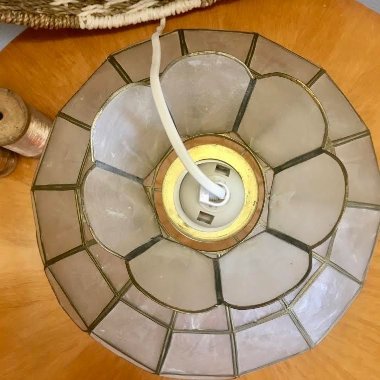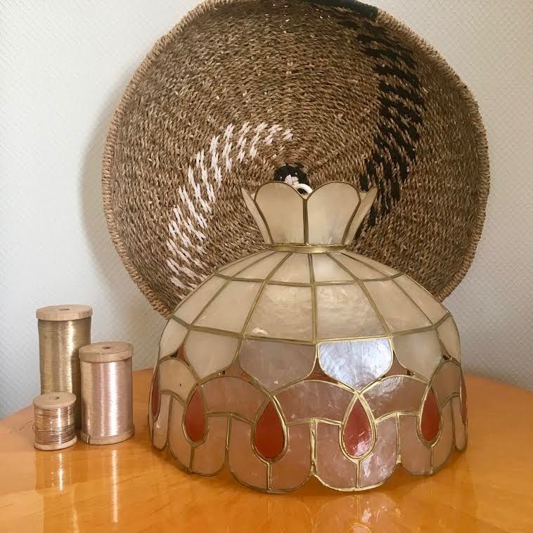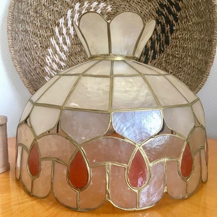 Belle suspension vintage en nacre et laiton blanc et rose avec collerette amovible des années 1970. En excellent état de conservation, elle donnera une touche d'éclectisme à votre décoration et se mariera parfaitement avec les couleurs et matières naturelles tel que le rotin ou l'osier pour un intérieur cosy. Du plus bel effet une fois installée. Elle est électrifiée et fonctionne parfaitement. Cordon électrique blanc mat neuf d'environ cm réglable et ajustable. Douille à vis blanc mat neuve. Ampoule à vis non fournie. Pièce unique. Origine France. Dimensions (cm) : Hauteur avec tige ajustable (soit 30 cm abat-jour seul) x Largeur 25. Vendu