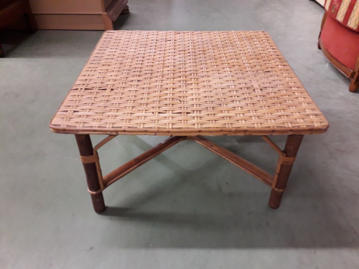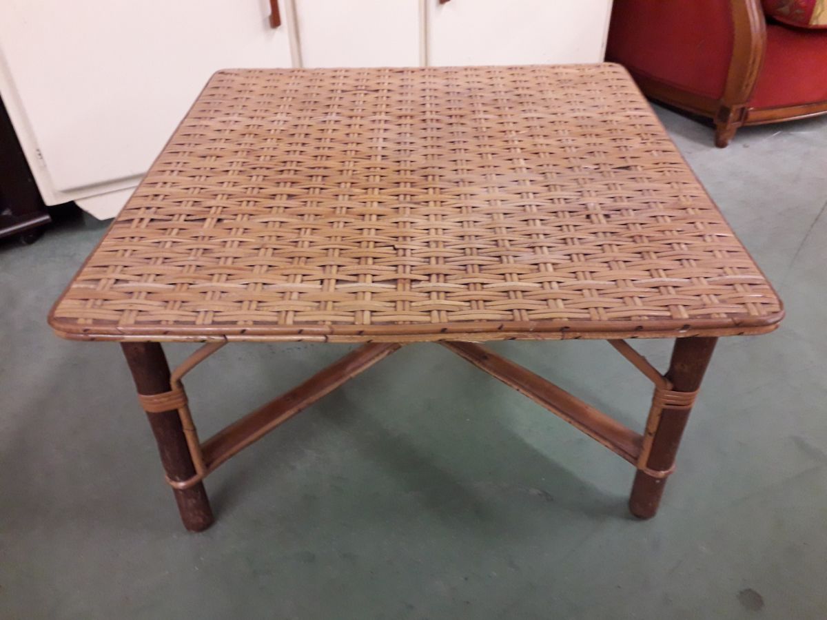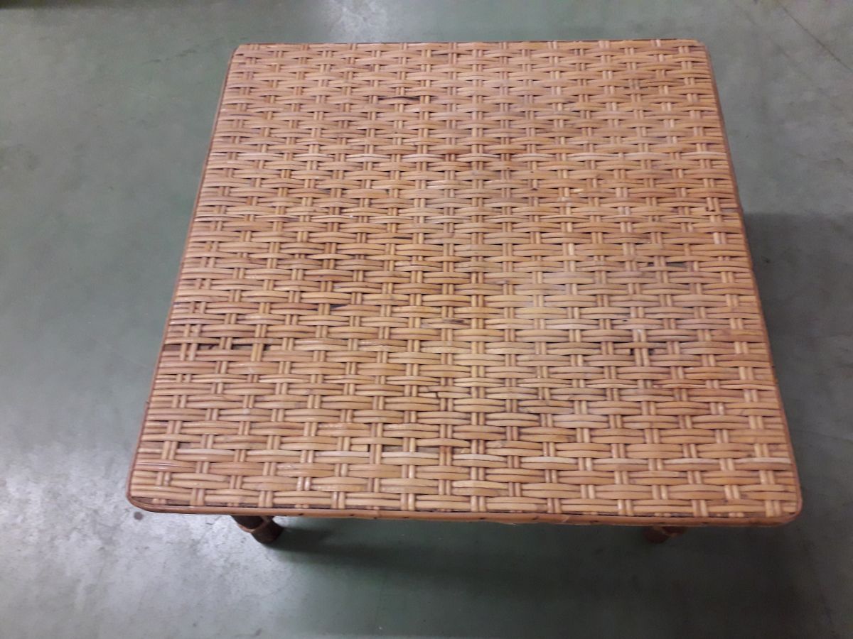 Table basse en rotin des années 60 avec un plateau tressé de forme carrée avec les bords arrondis.